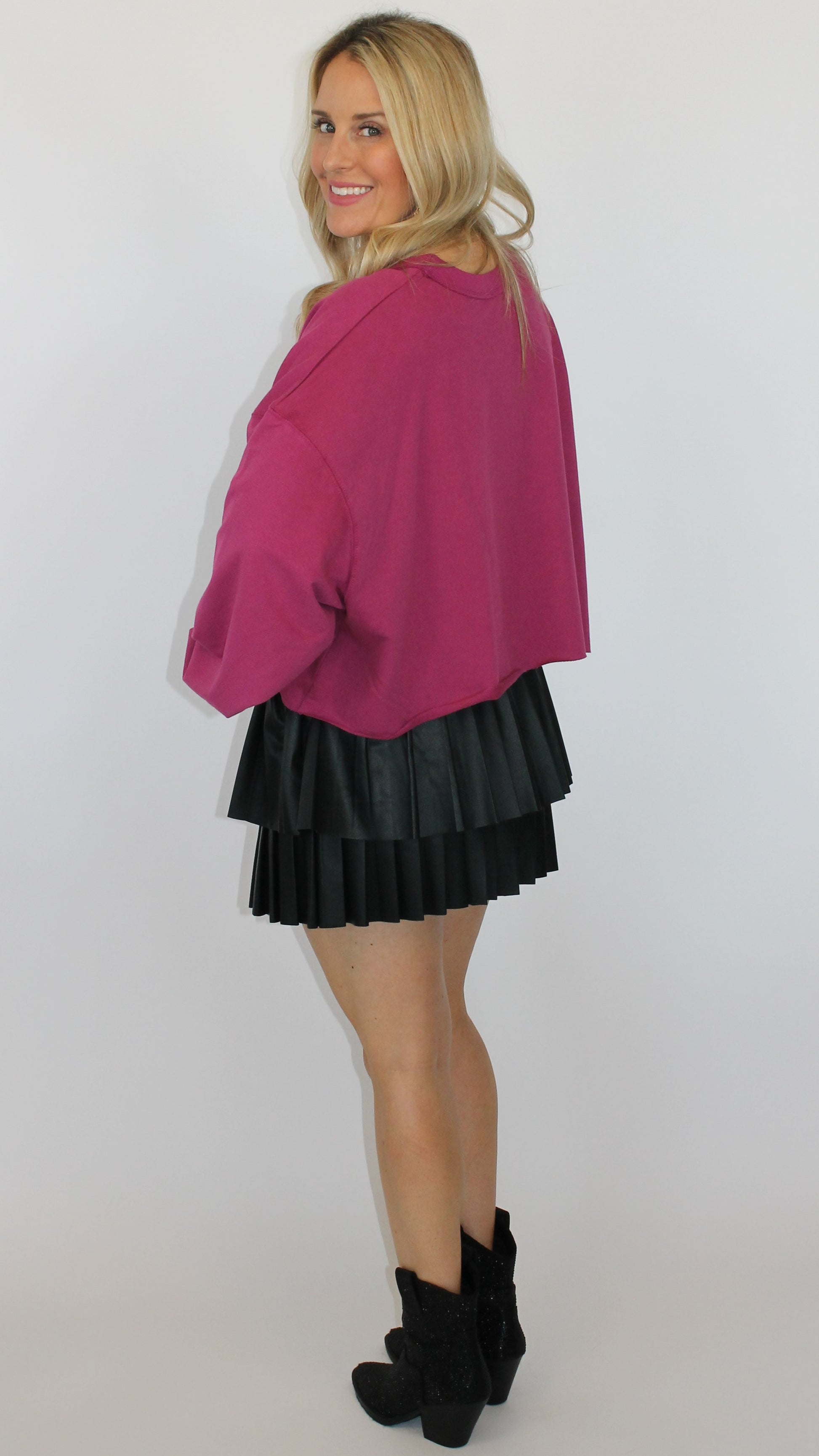 Amazing leather mini skirt! Dress it up or down, you can't go wrong in this double layered pleated mini skirt. Soft faux leather shapes this mini skirt with a high waist adorned with a matching belt and belt loops. Double layers of pleating makes a flouncy mini skirt silhouette. Hidden zipper on the side. Lined with little shorts underneath.