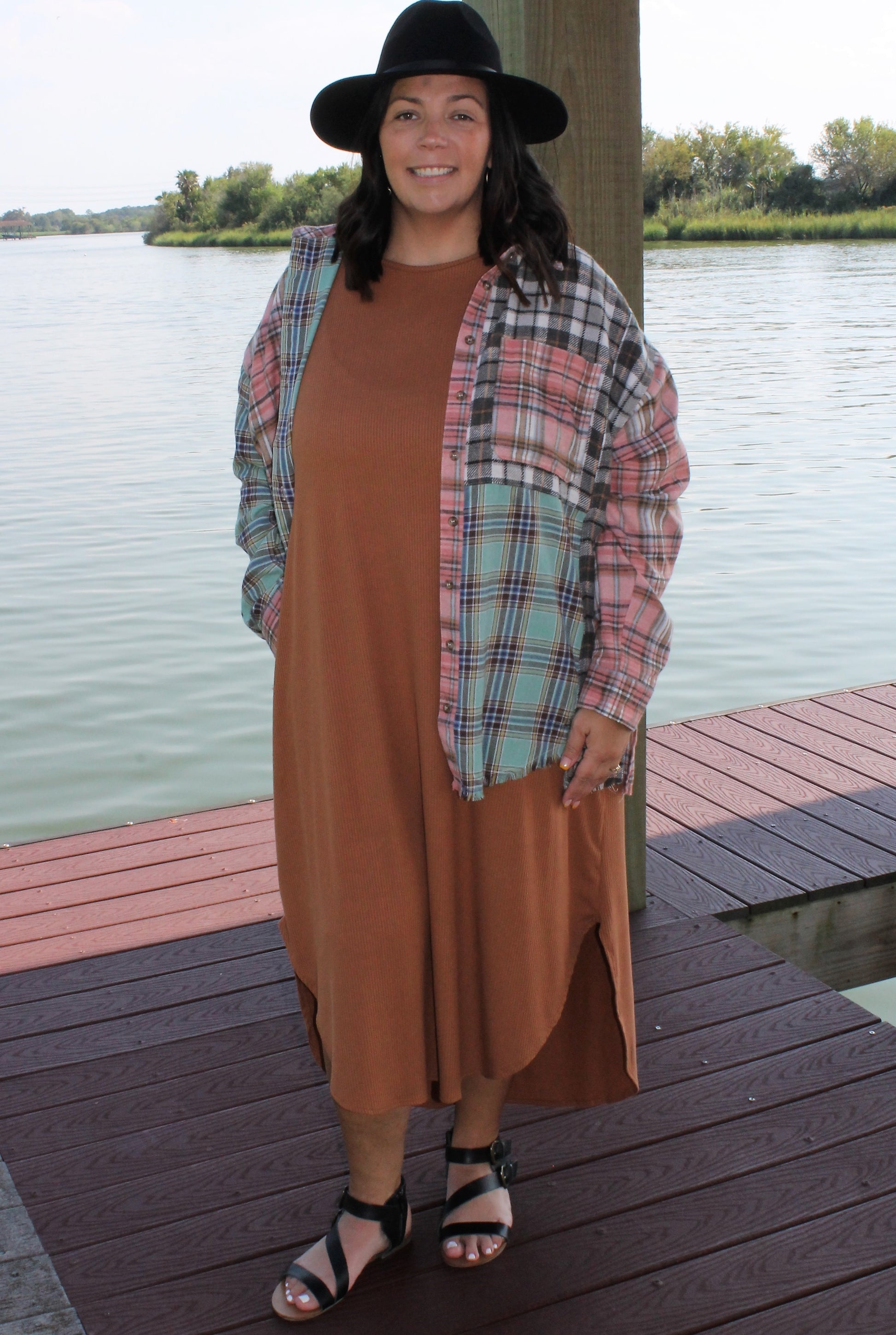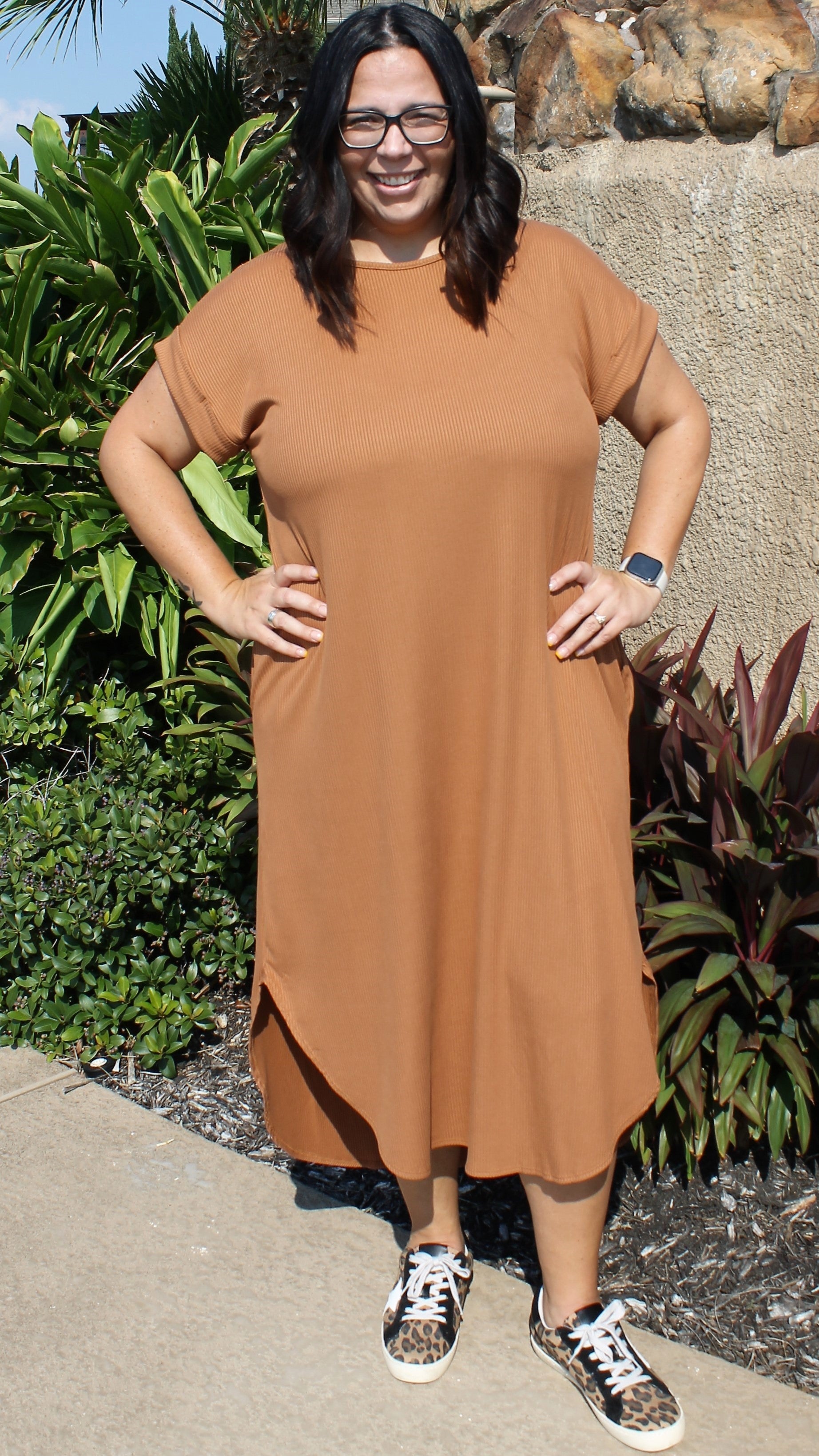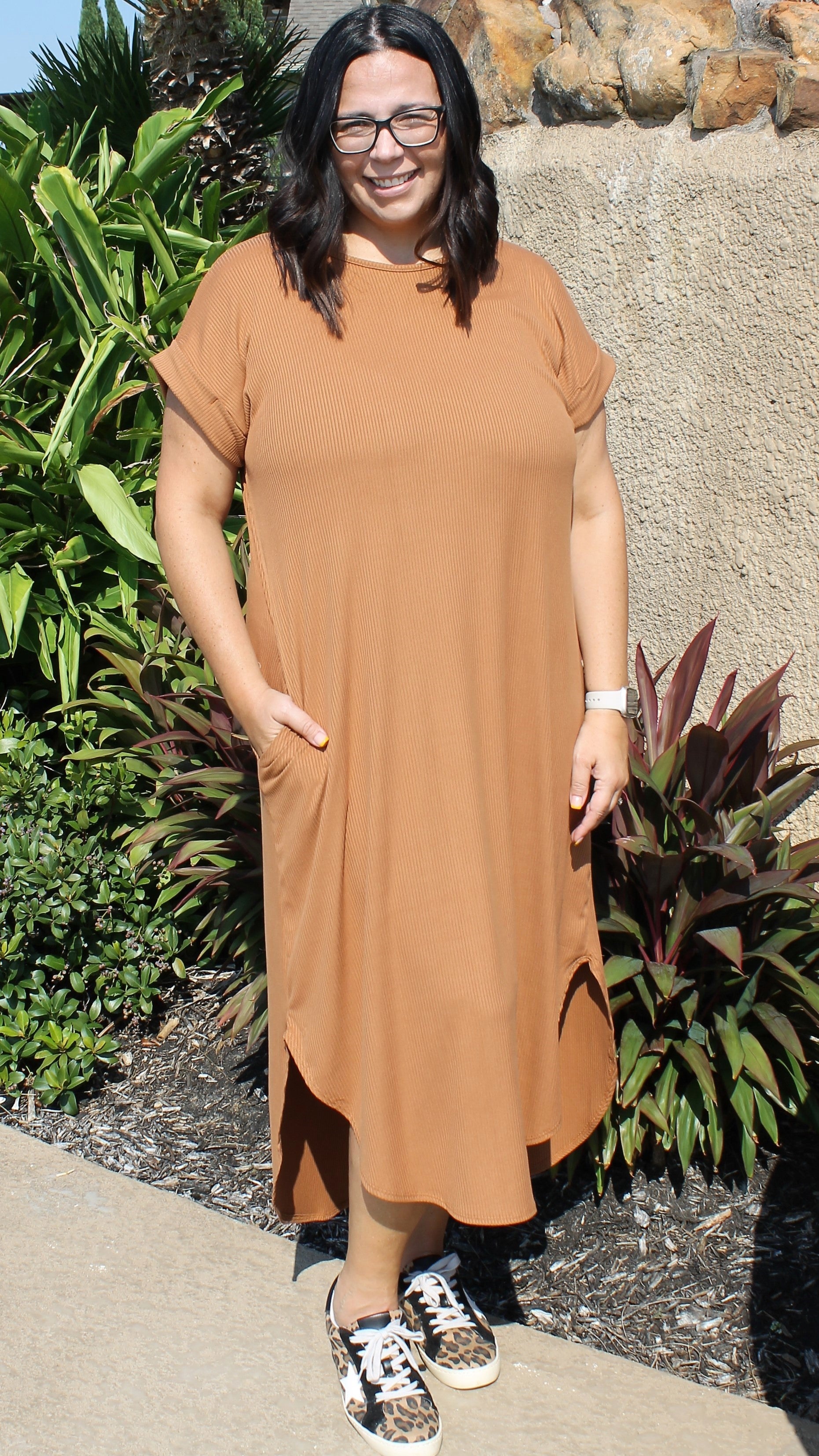 This was our model's favorite dress! She said it is SO comfortable. Round neck, short sleeve midi dress featuring tulip hem and permanent rolled cuffs. Pockets at side. Unlined. Knit. Non-sheer. Lightweight.