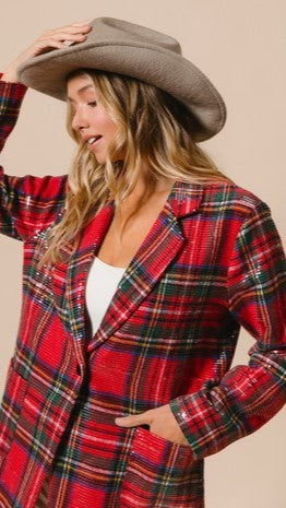 Add some festive cheer to your outfit with this blazer! Classic red plaid fabric This jacket features a collared neckline, hidden button closure, pocket detail, long sleeves, and gold decorative buttons.