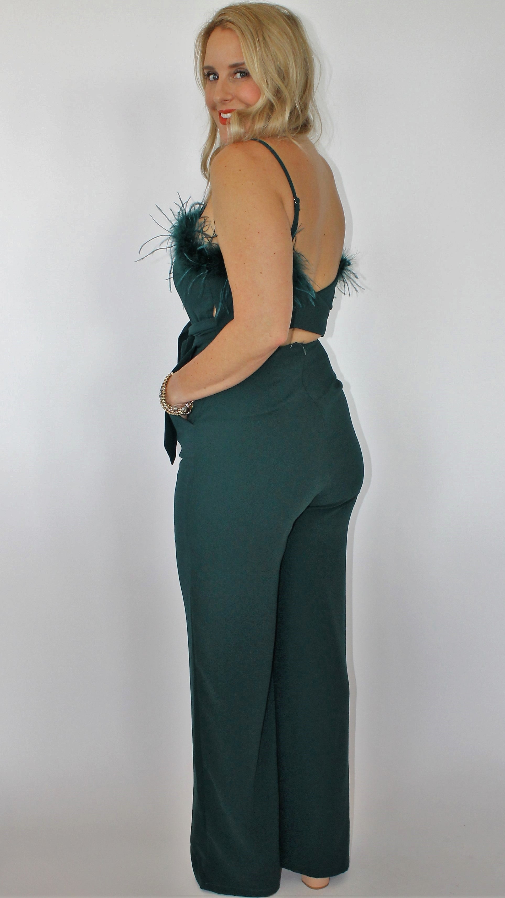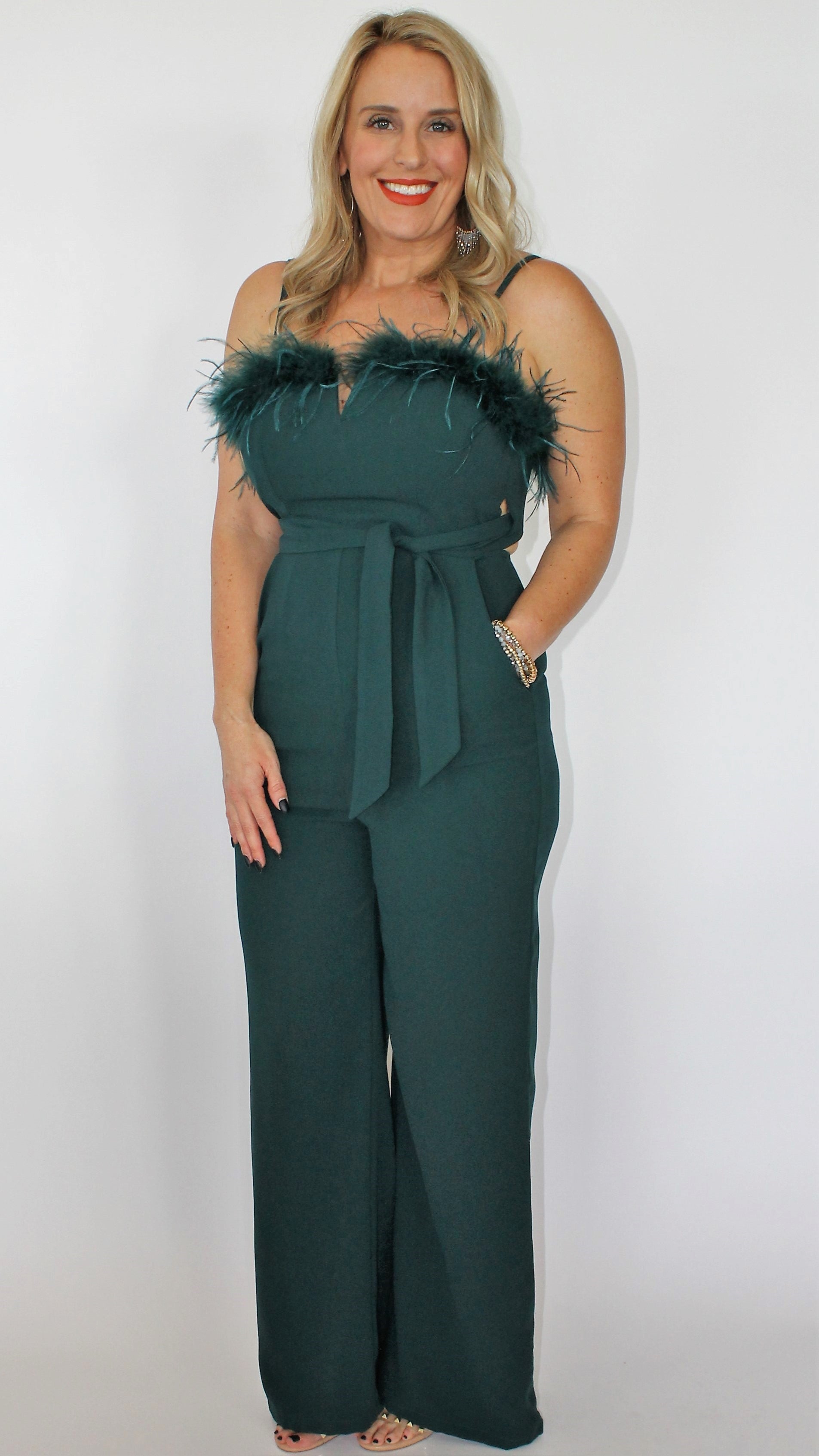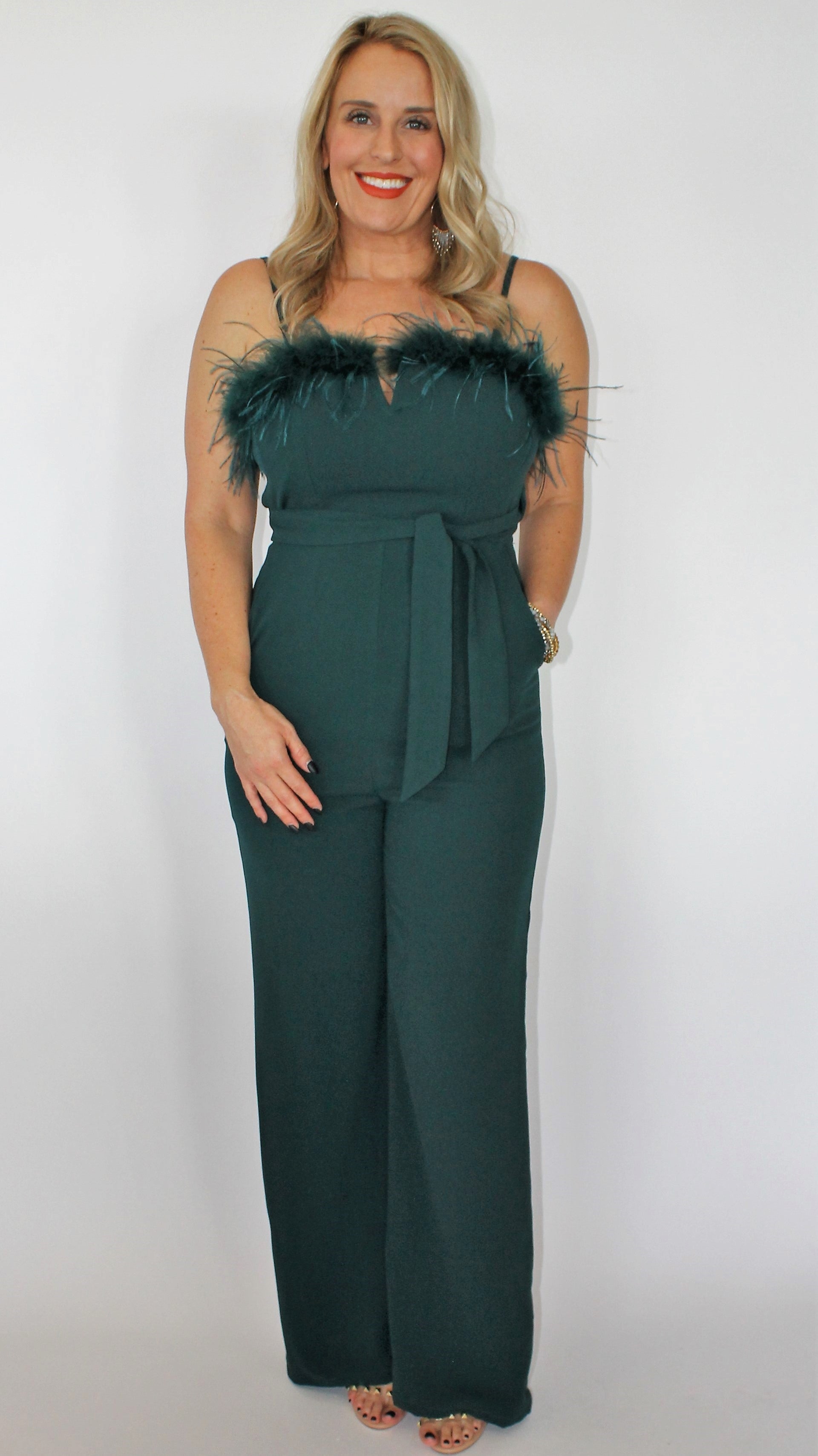 Stunning jumpsuit! Spaghetti strap jumpsuit featuring feather trim detail at bust and self tie waist. Open back detail. V-wire insert at bust. Invisible zipper at back. Pockets at side. Lined.