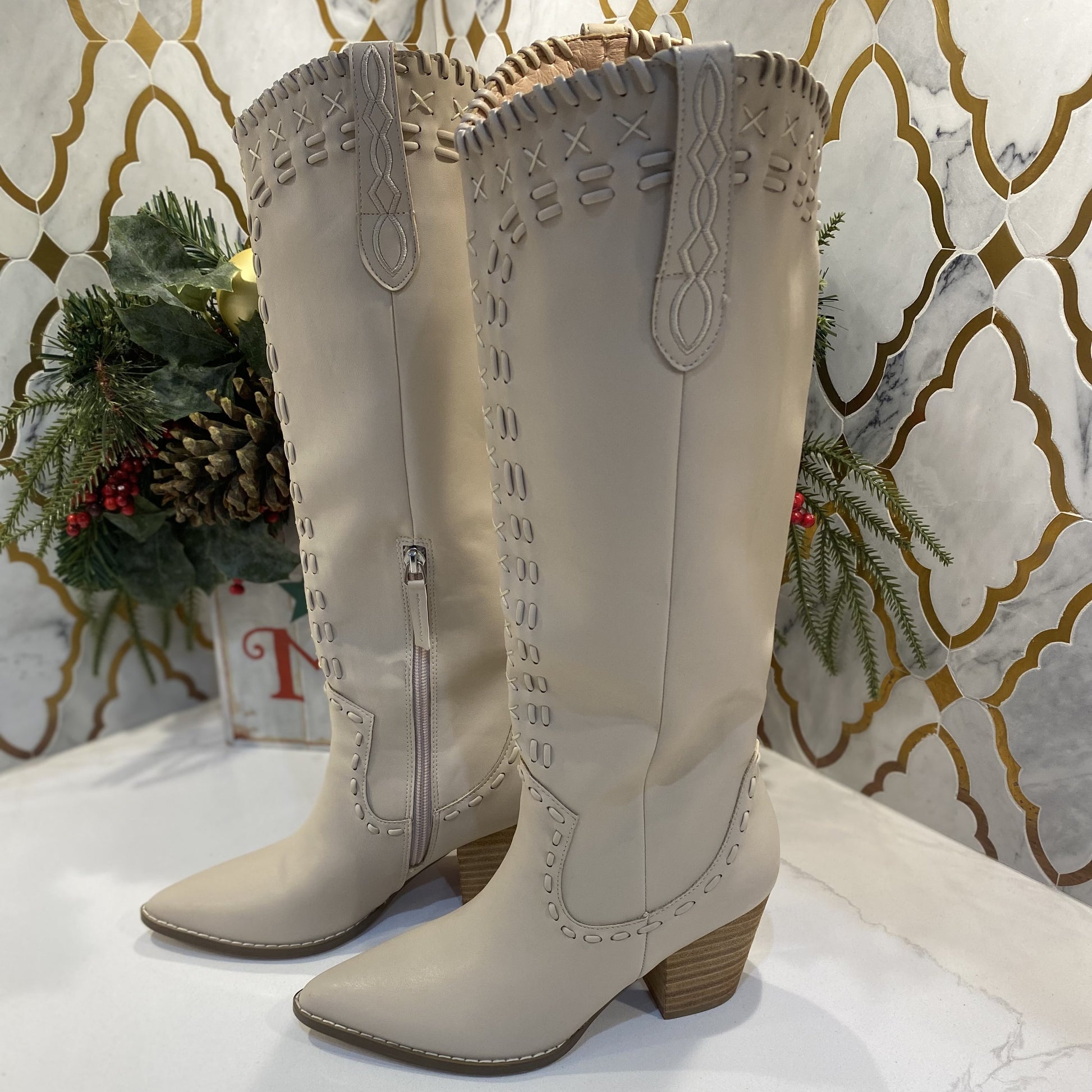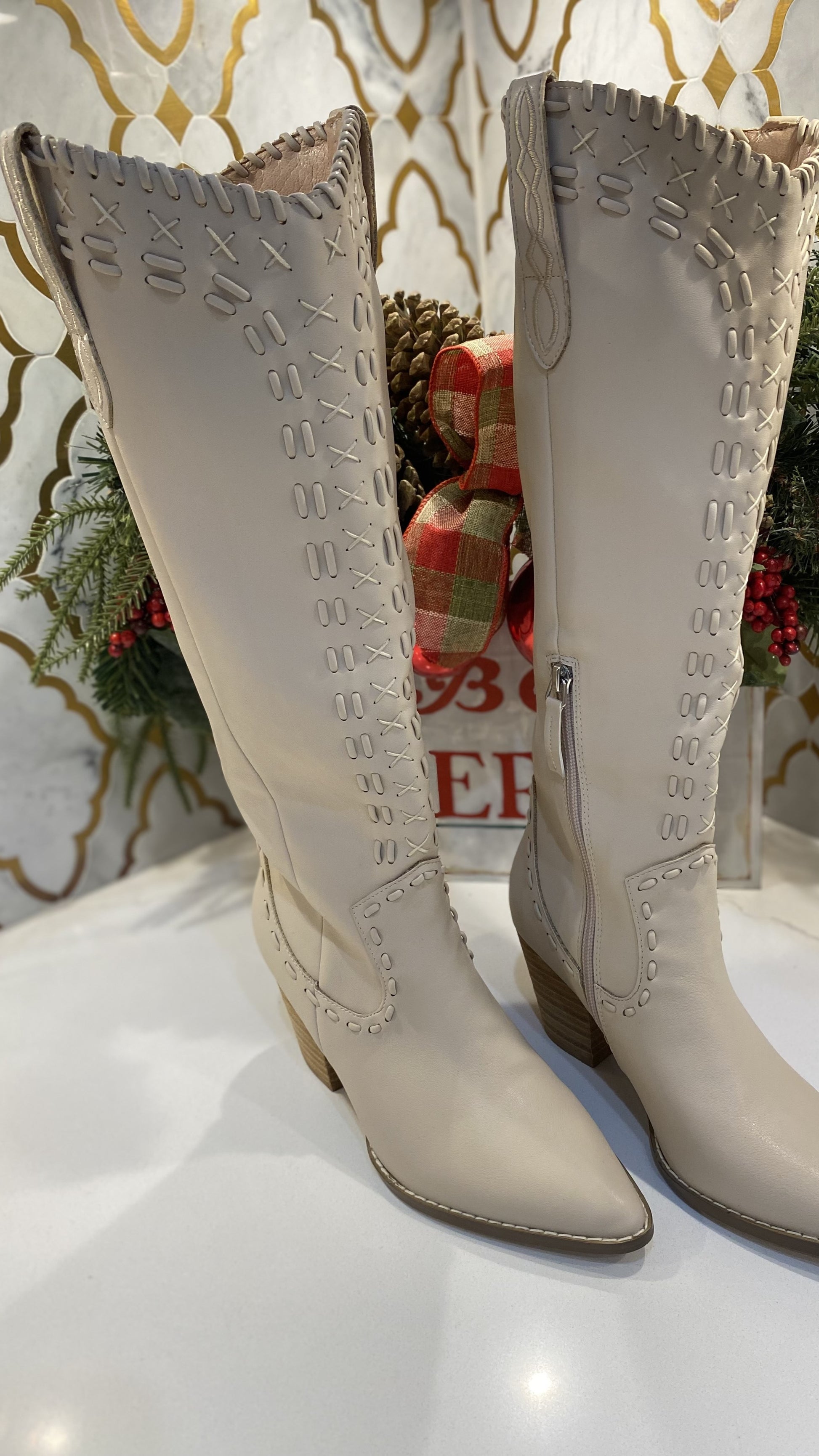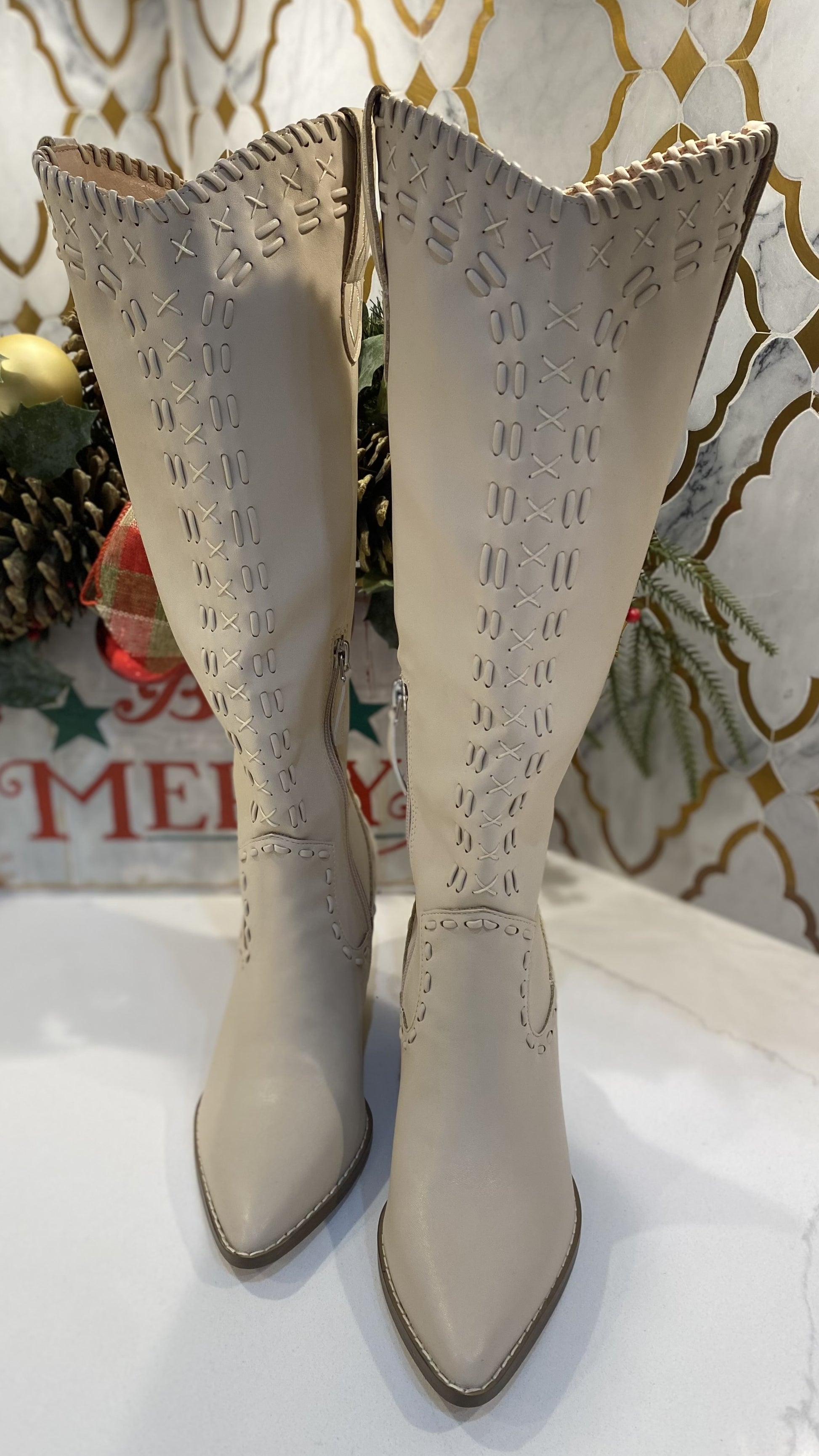 These are gorgeous, show stopping boots! Beautiful knee-high leather boots with lace stitching and embroidered detail. Neutral color goes with everything! Pointed toe, zipper on the inside, and so comfortable. 2" heel.