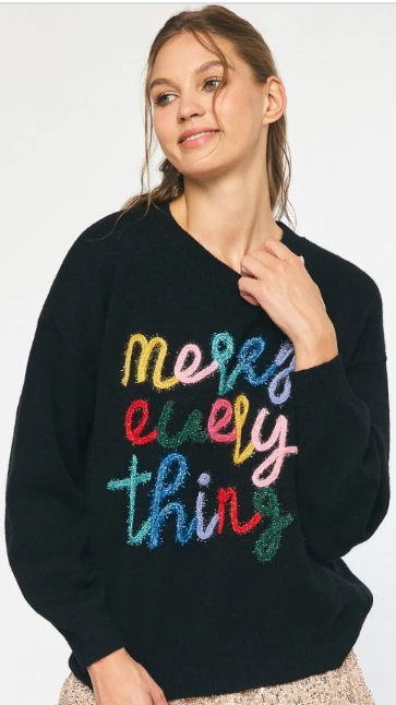 Round neck fuzzy knit sweater featuring lettering trimming detail. Rib detail at neckline and hem. Unlined. Knit. Non-sheer. Lightweight.