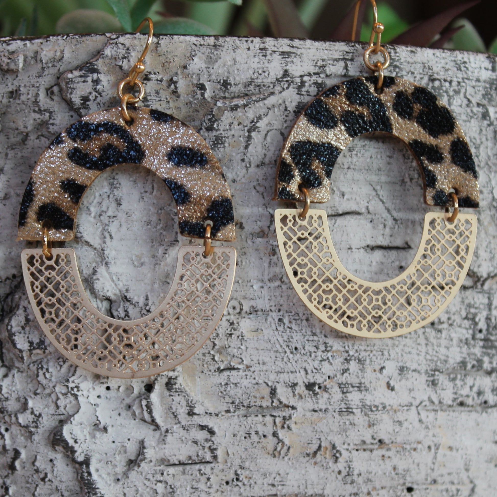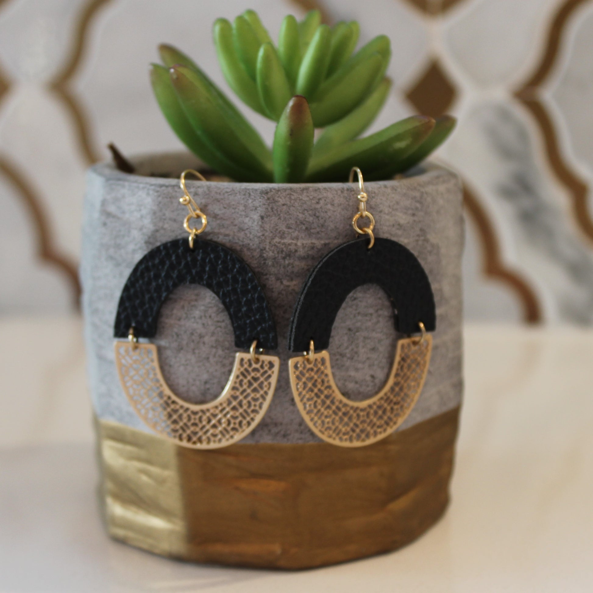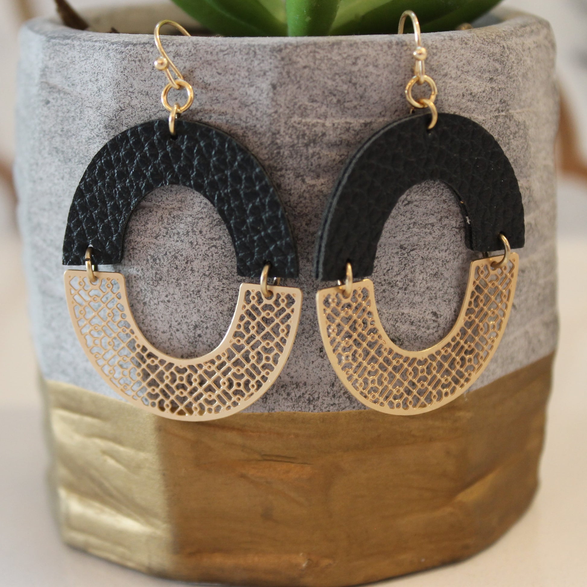I am loving these mixed media earrings! Top half is leather and bottom half is gold metal with laser cut detail.