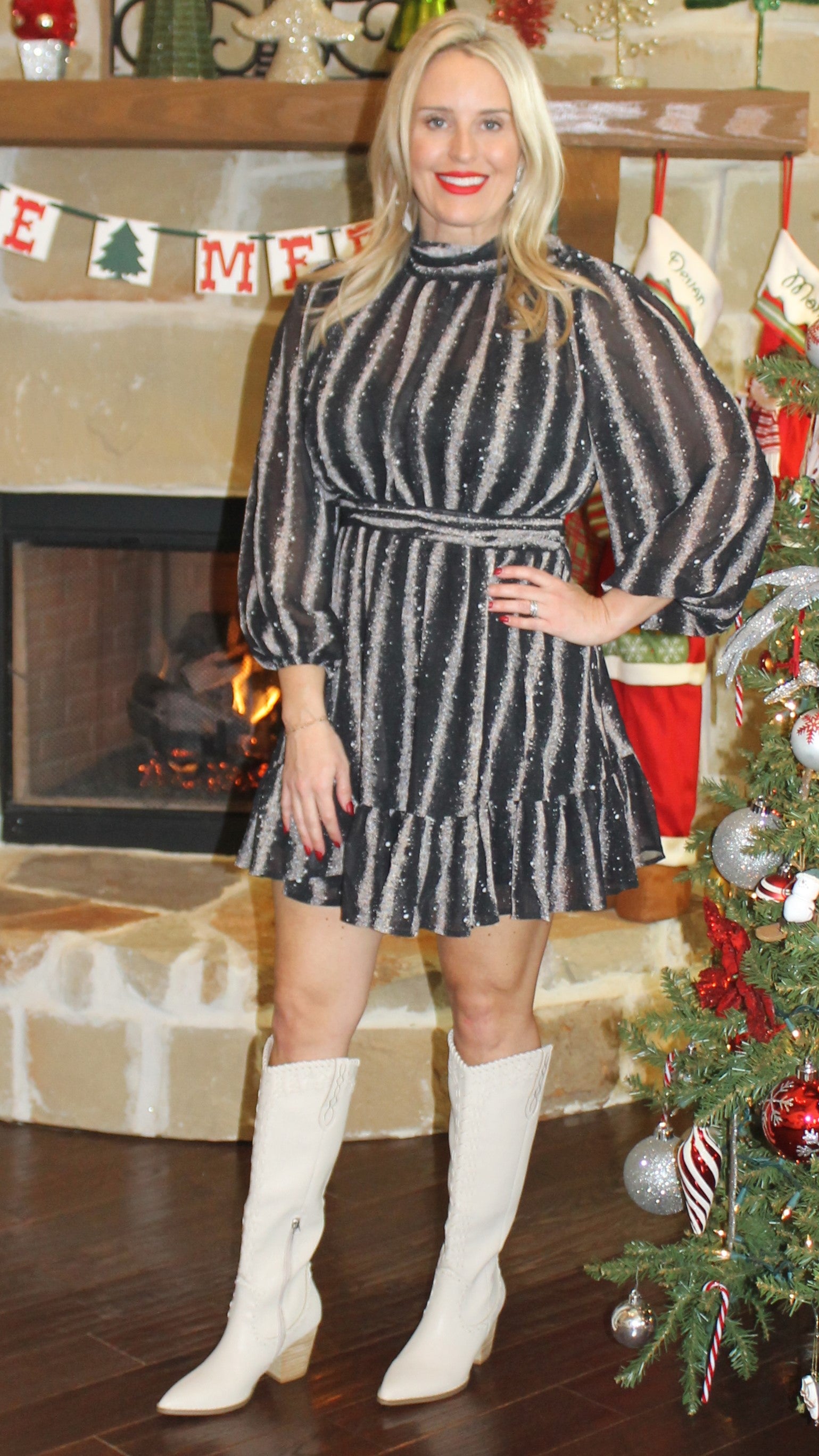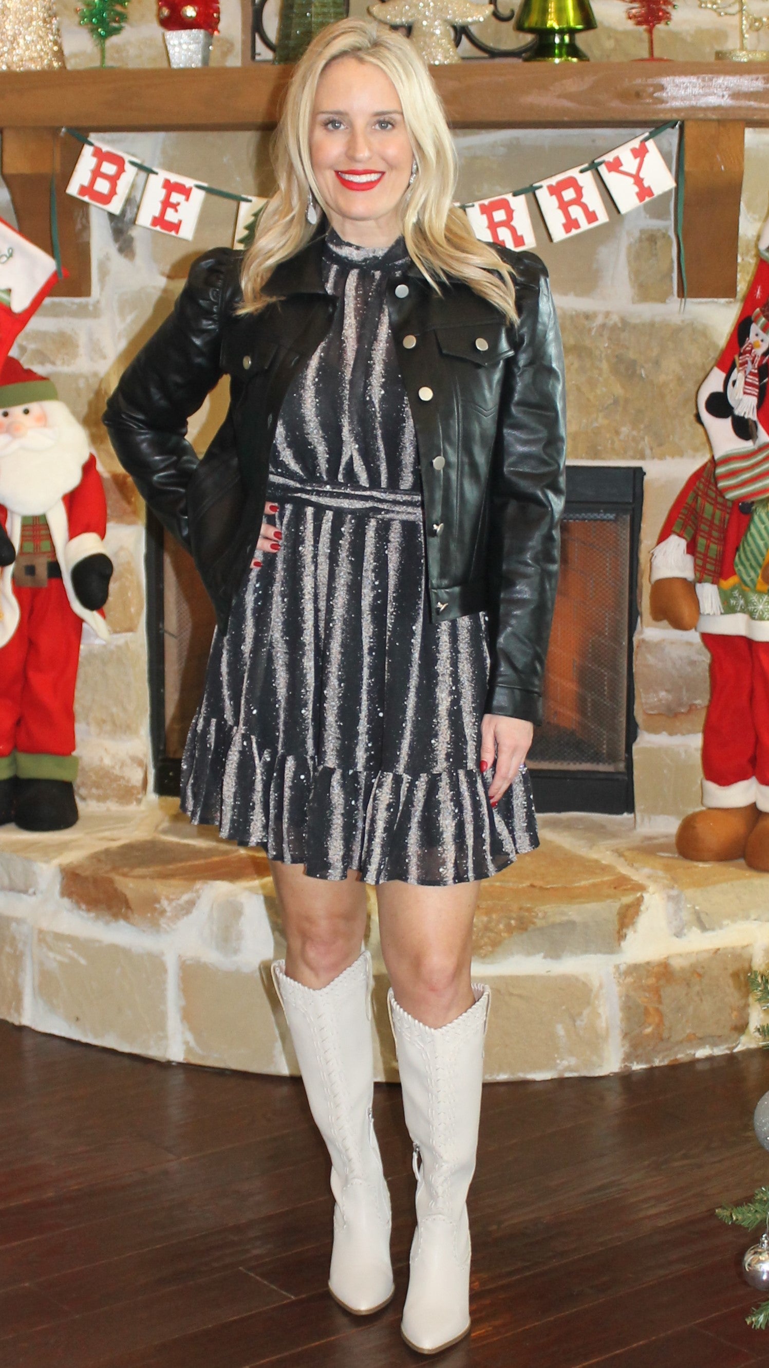 Shown paired with our faux leather button down jacket and lacey leather boots.
