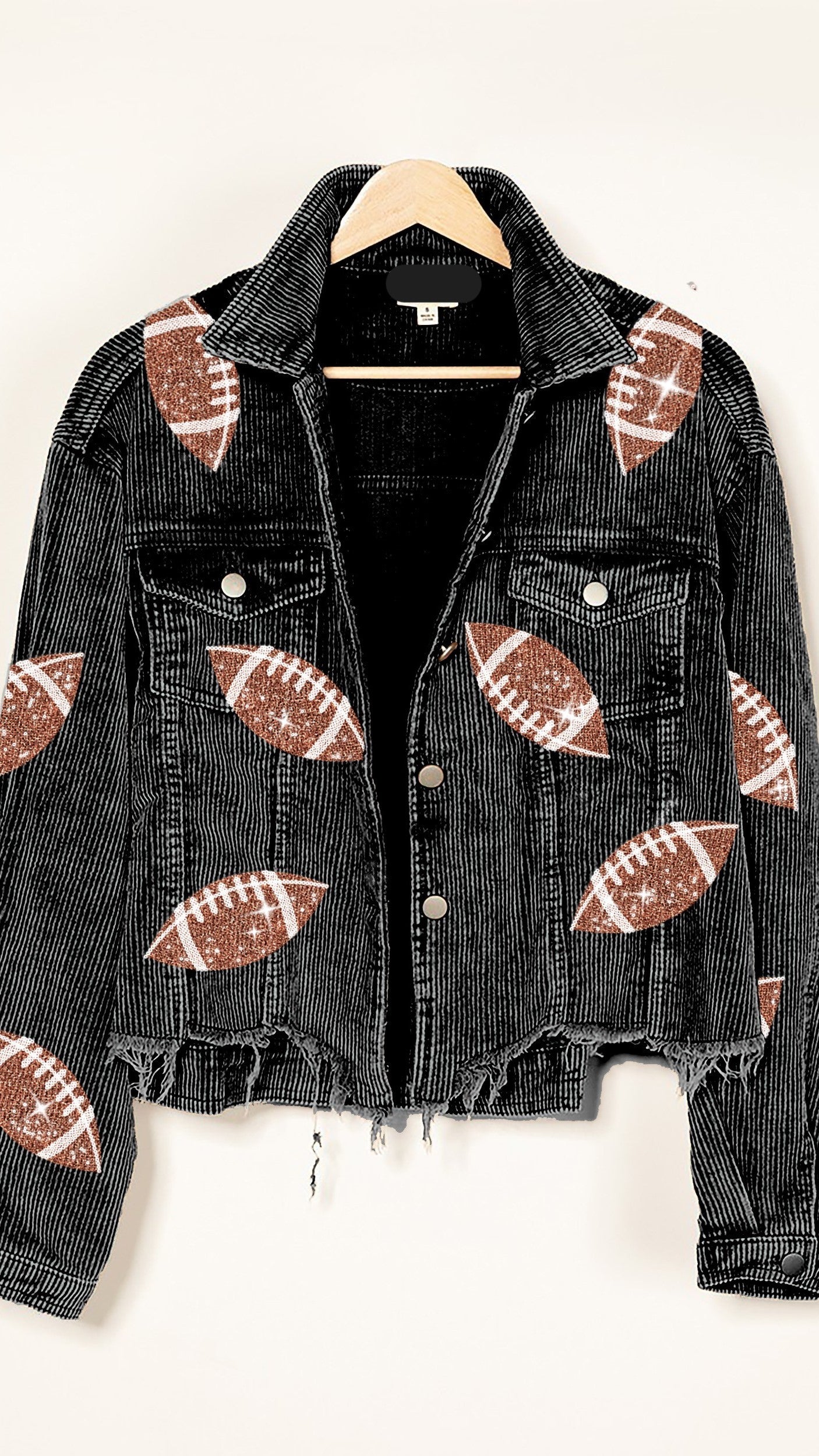 It's here! Be the star of the show this football season! Stand out with this Game Day Football Jacket. It's made from vintage washed corduroy with sparkly sequin embroidered footballs that will wow 'em on the field. Plus, the frayed hem and button snaps at wrist give that extra something-something to make your look stand out! Go long and get yours today!