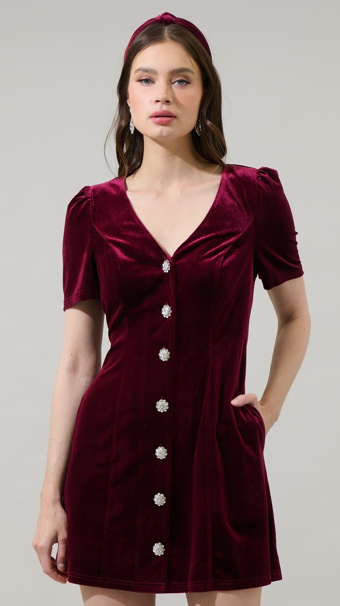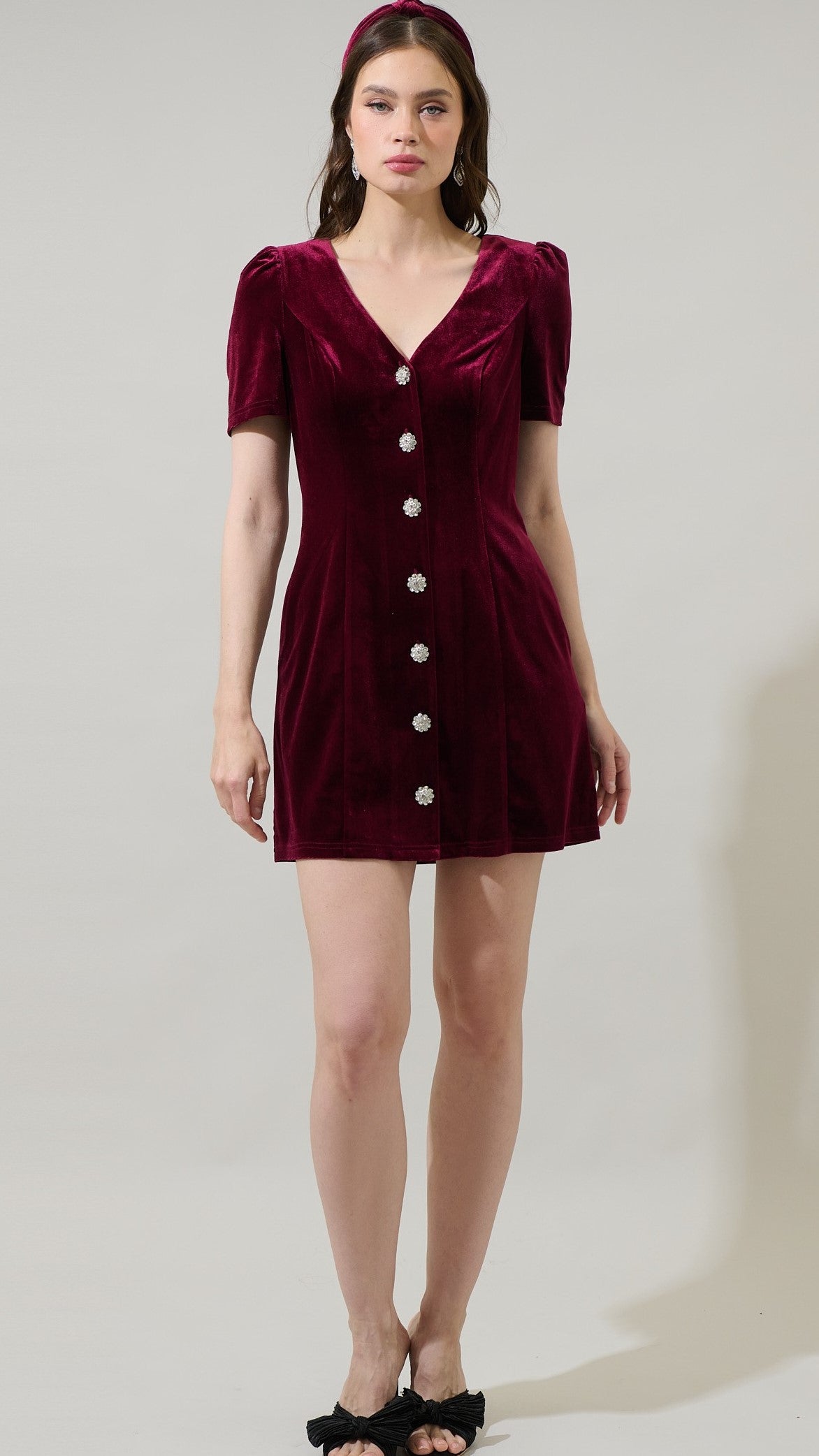 Introducing our Rhinestone Button Velvet Dress! The ideal mix of elegance and style for the holidays and fall season. Made of luxurious velvet, it features a gathered shoulder and shapely silhouette. The rhinestone buttons add a touch of glamour, while princess seams and a hidden zipper offer a flawless fit.
