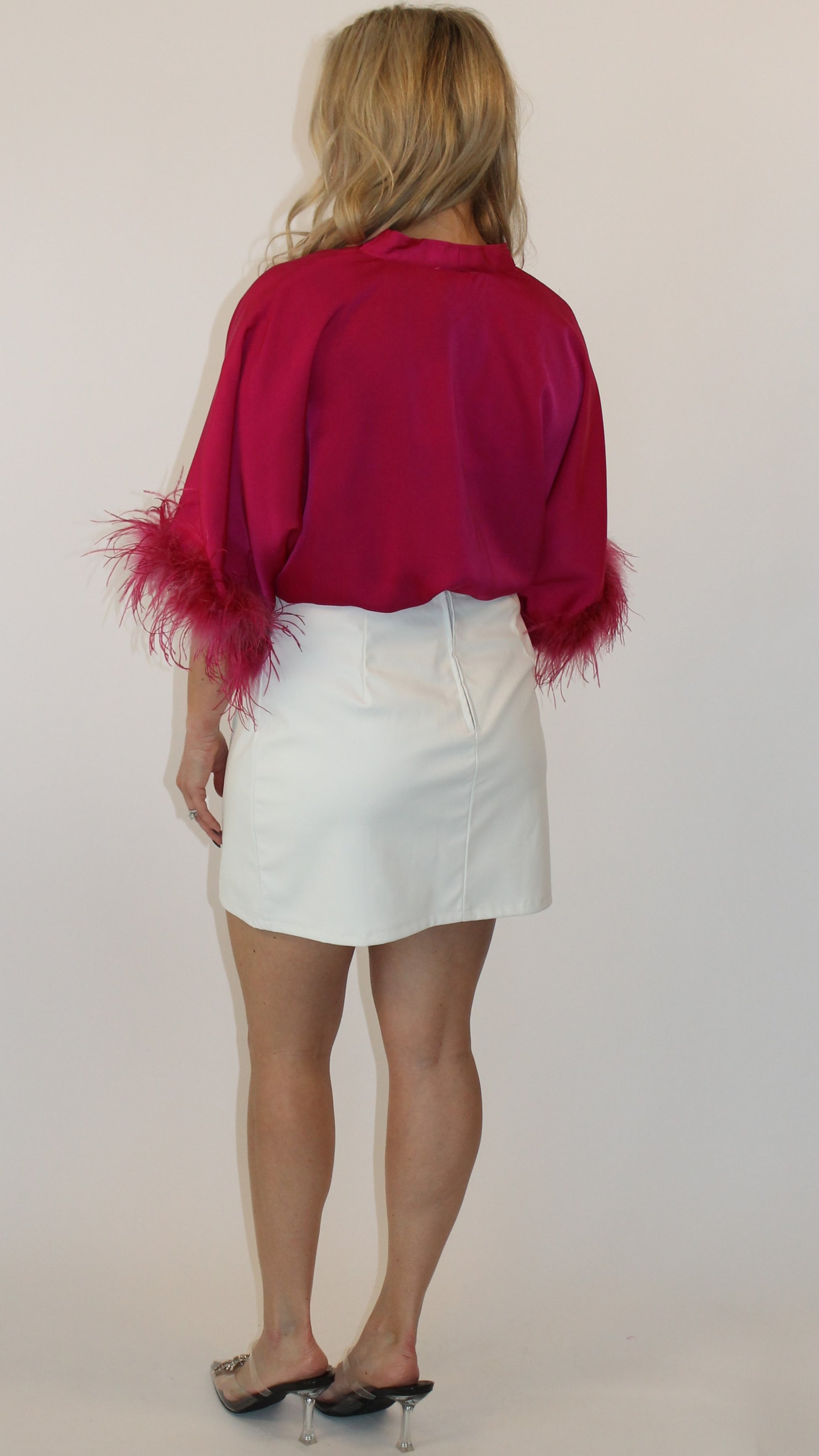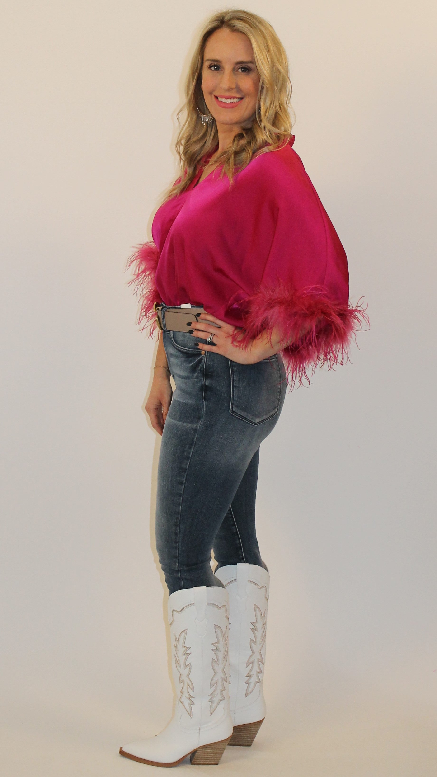Such a fun bodysuit! Dolman sleeves with bell feather trim cuffs, v-cut neckline, flowy fit with a snap closure.