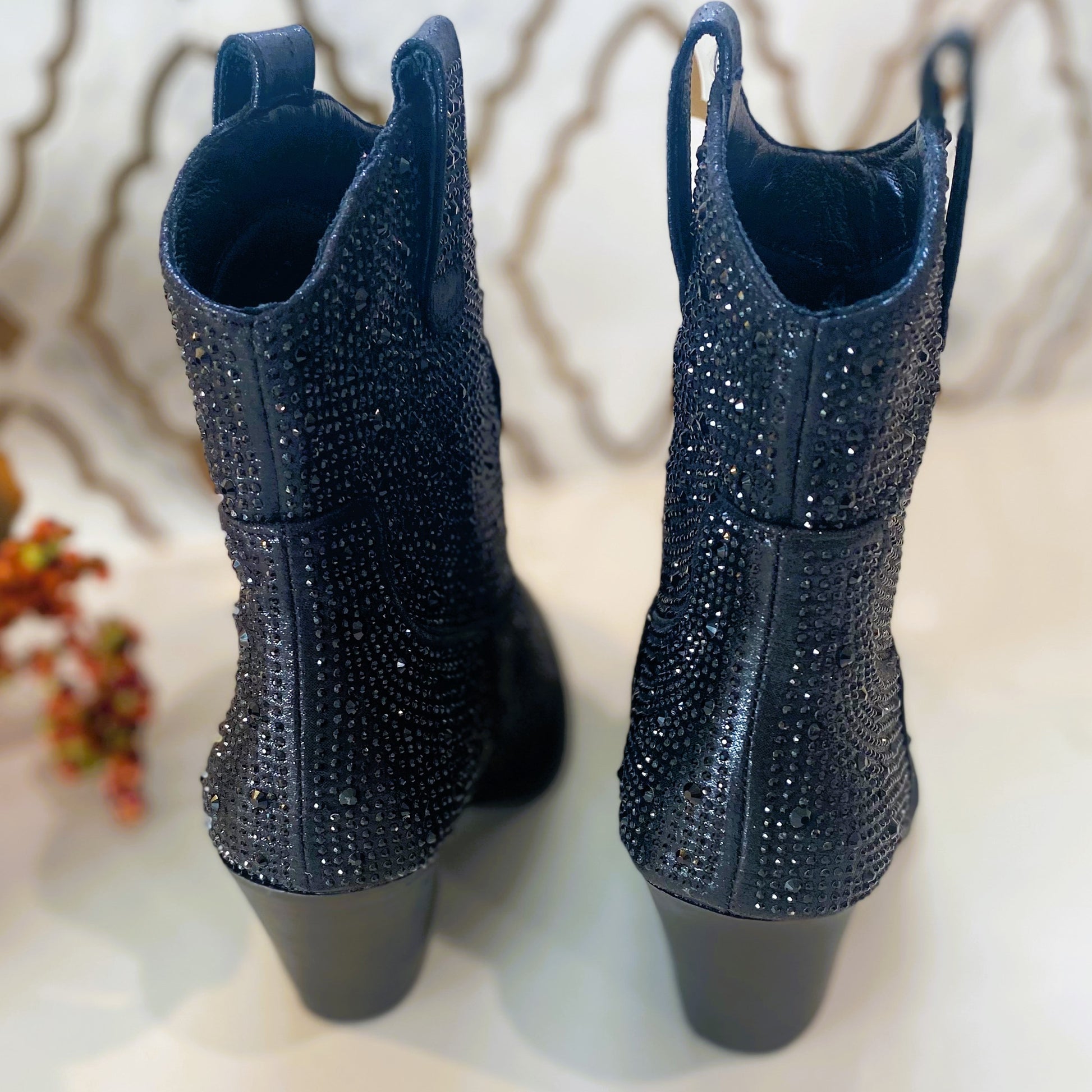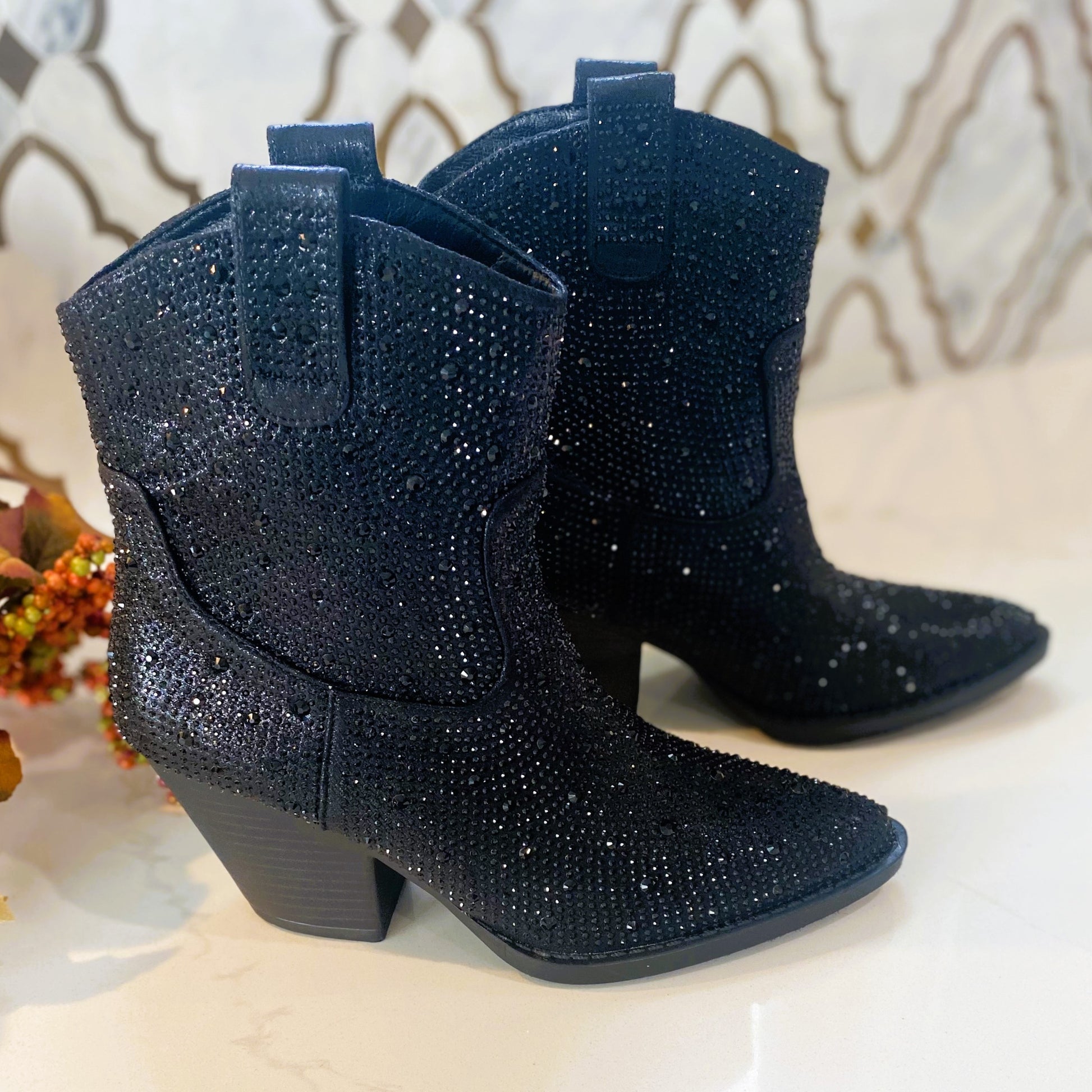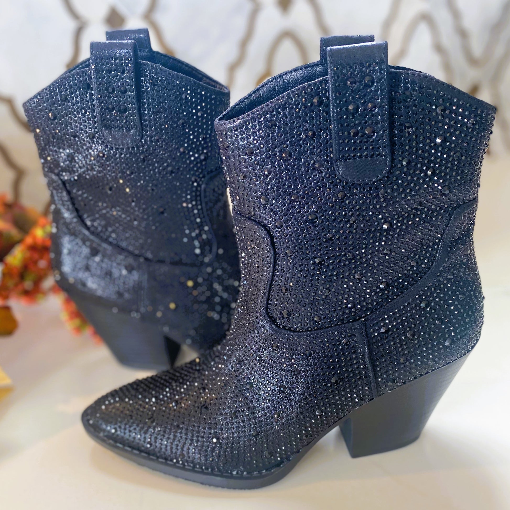 Add these glam booties to your closet! Covered in rhinestones they will sparkle with everything you wear. Pointed toe, slip on style, and so comfortable.