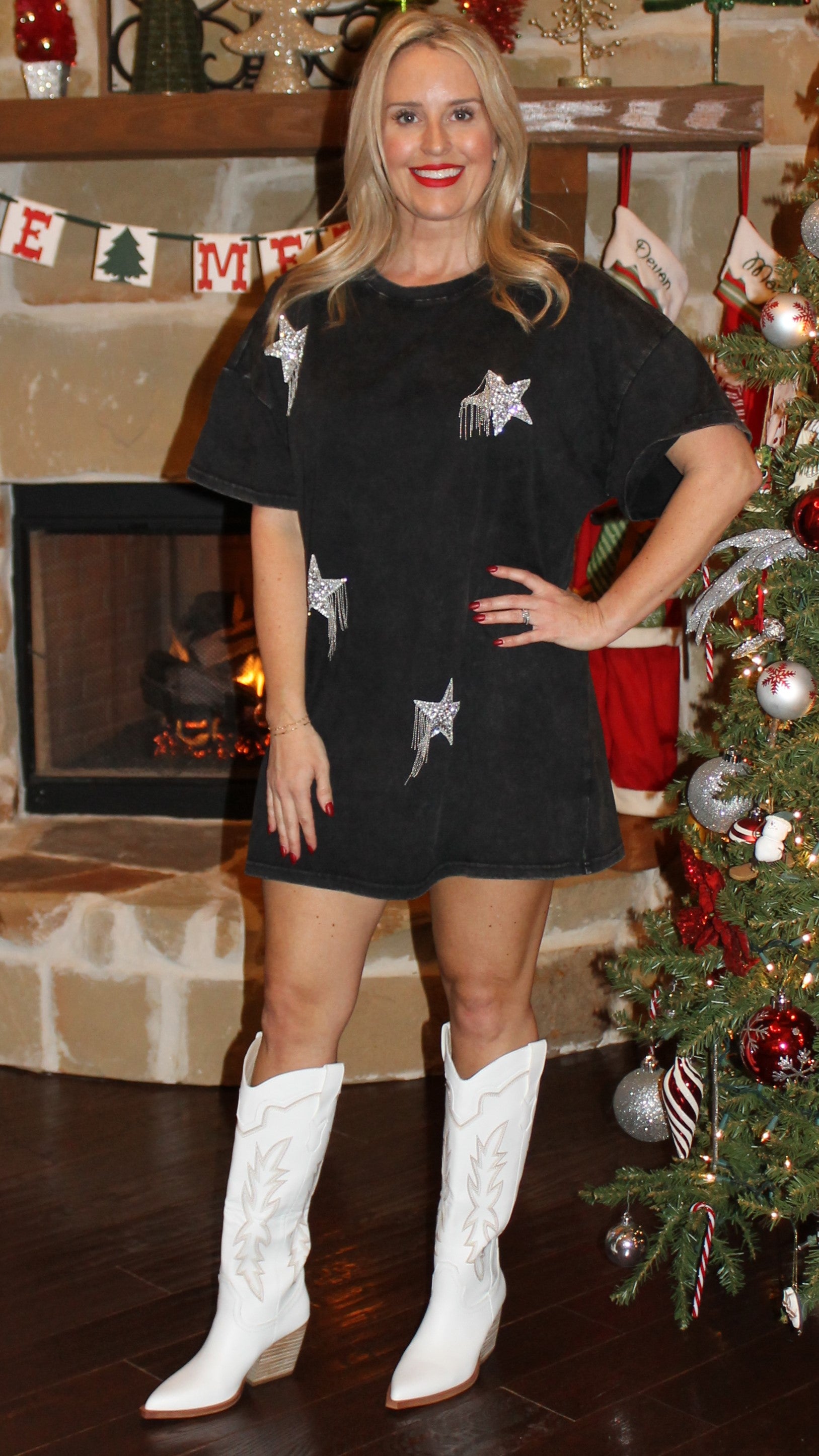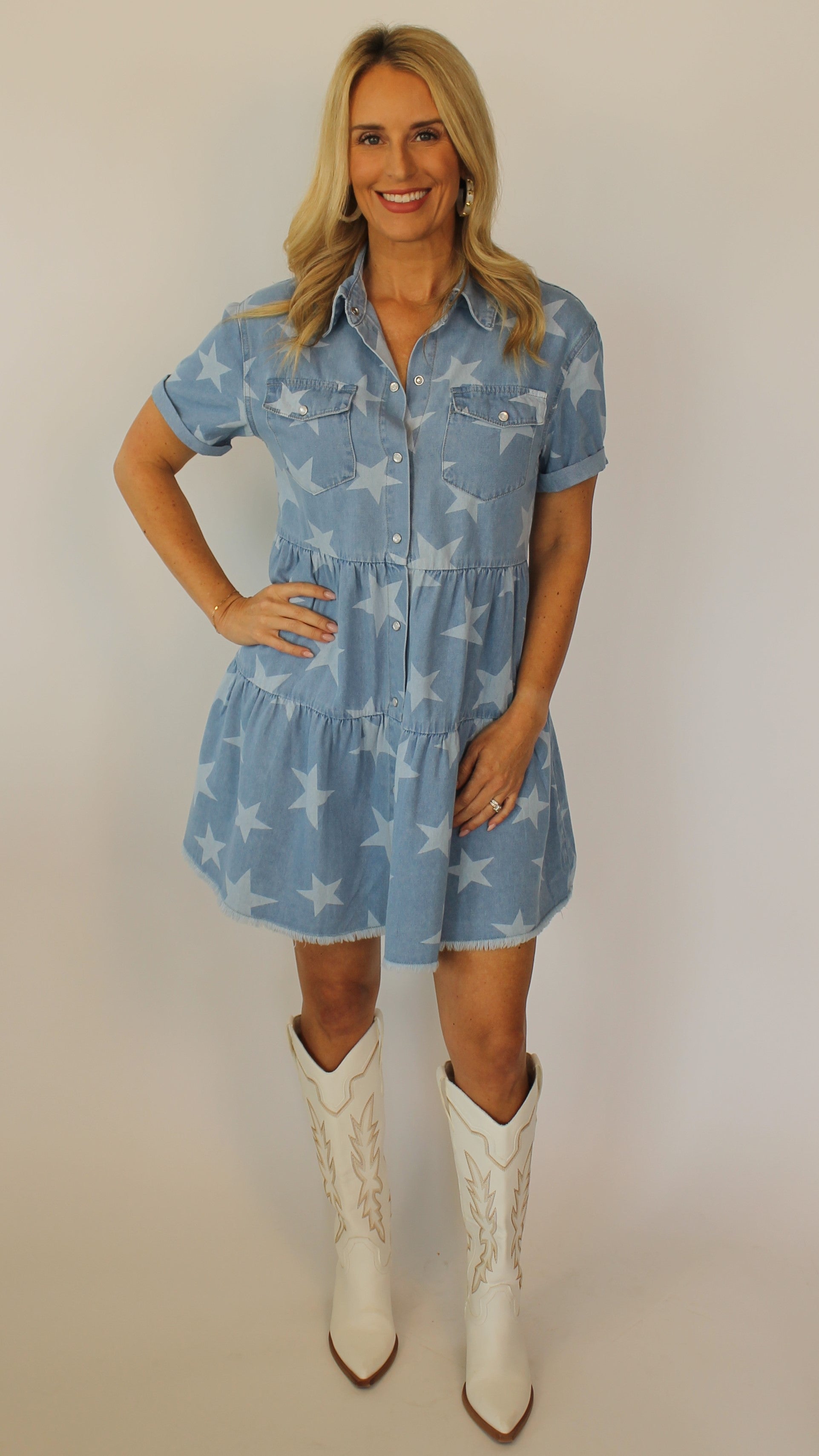 Shown paired with our judy blue tummy control skinny jeans, shooting stars t-shirt dress, and pink utility dress.