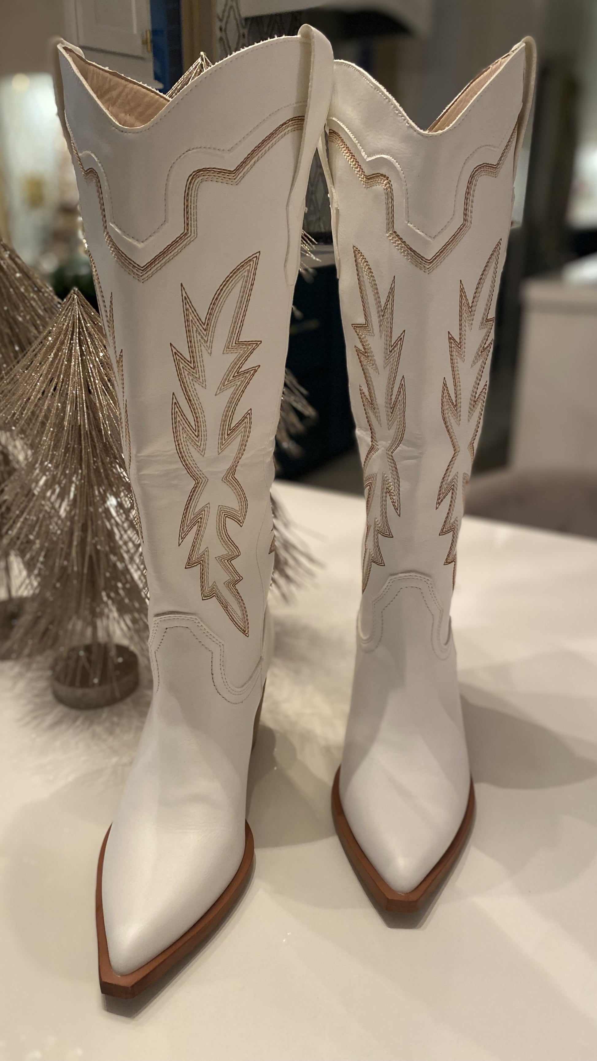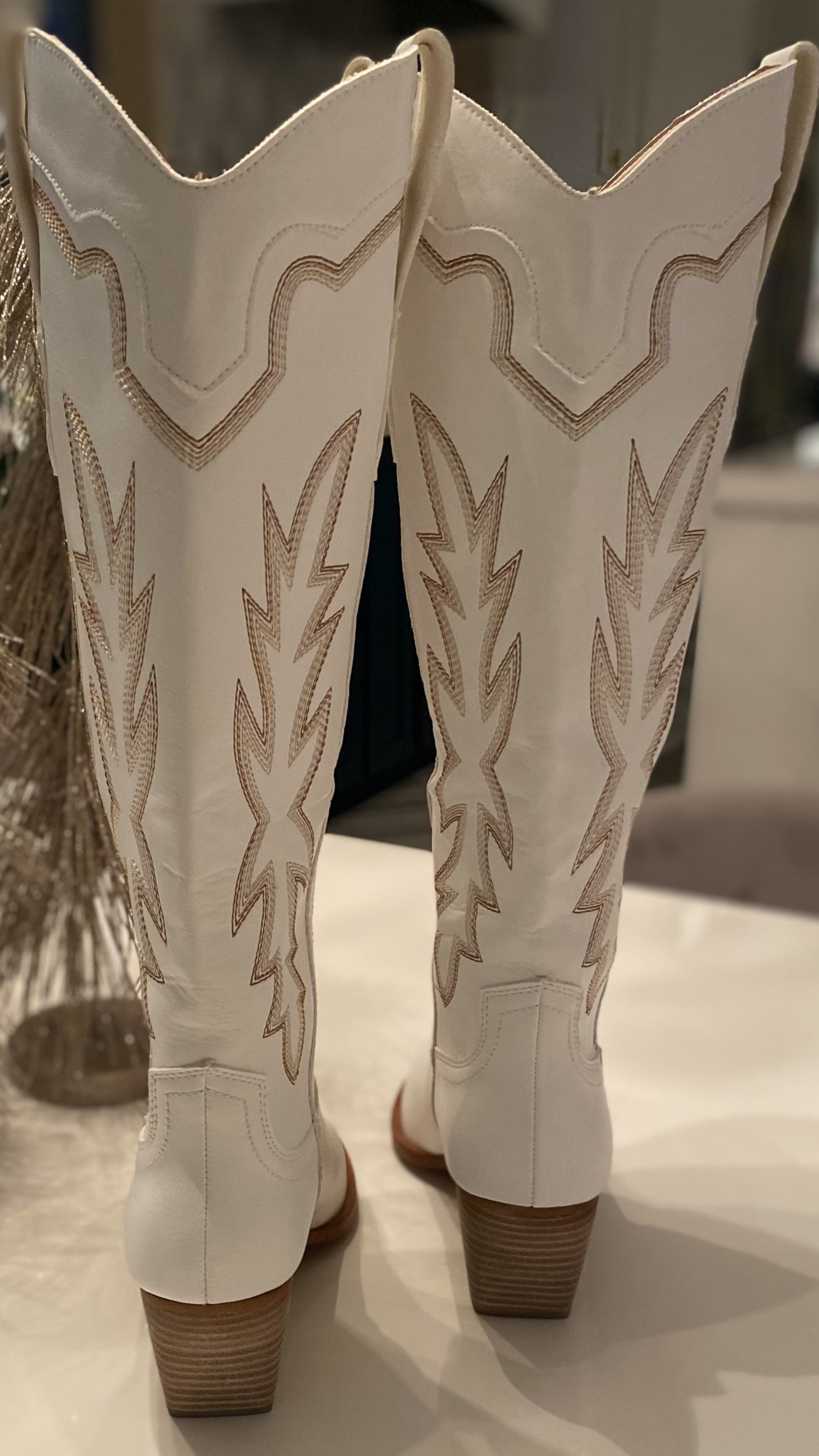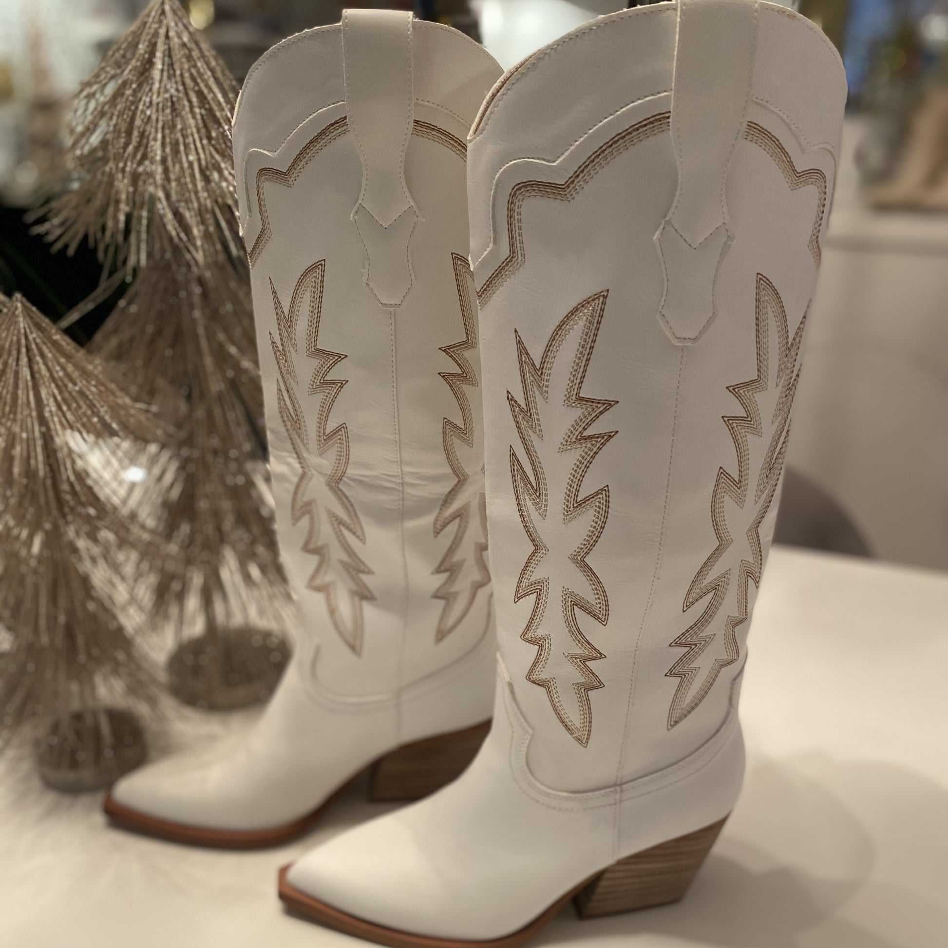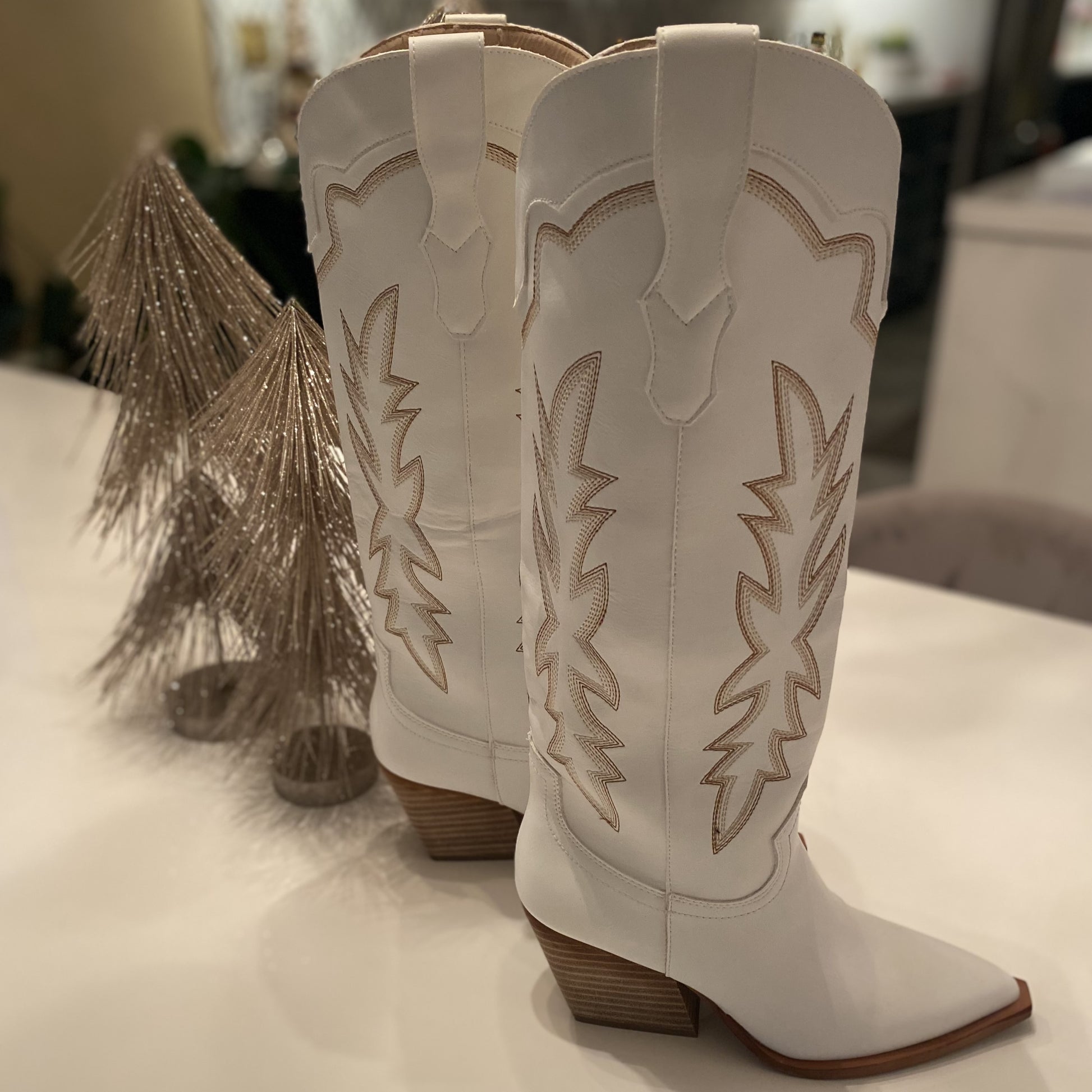 These are the boots y'all have been waiting for! Beautiful white leather western style boots with a trendy twist. Adorned with gorgeous embroidered detail. Pointed toe, slip on style, and so comfortable. 2" heel.
