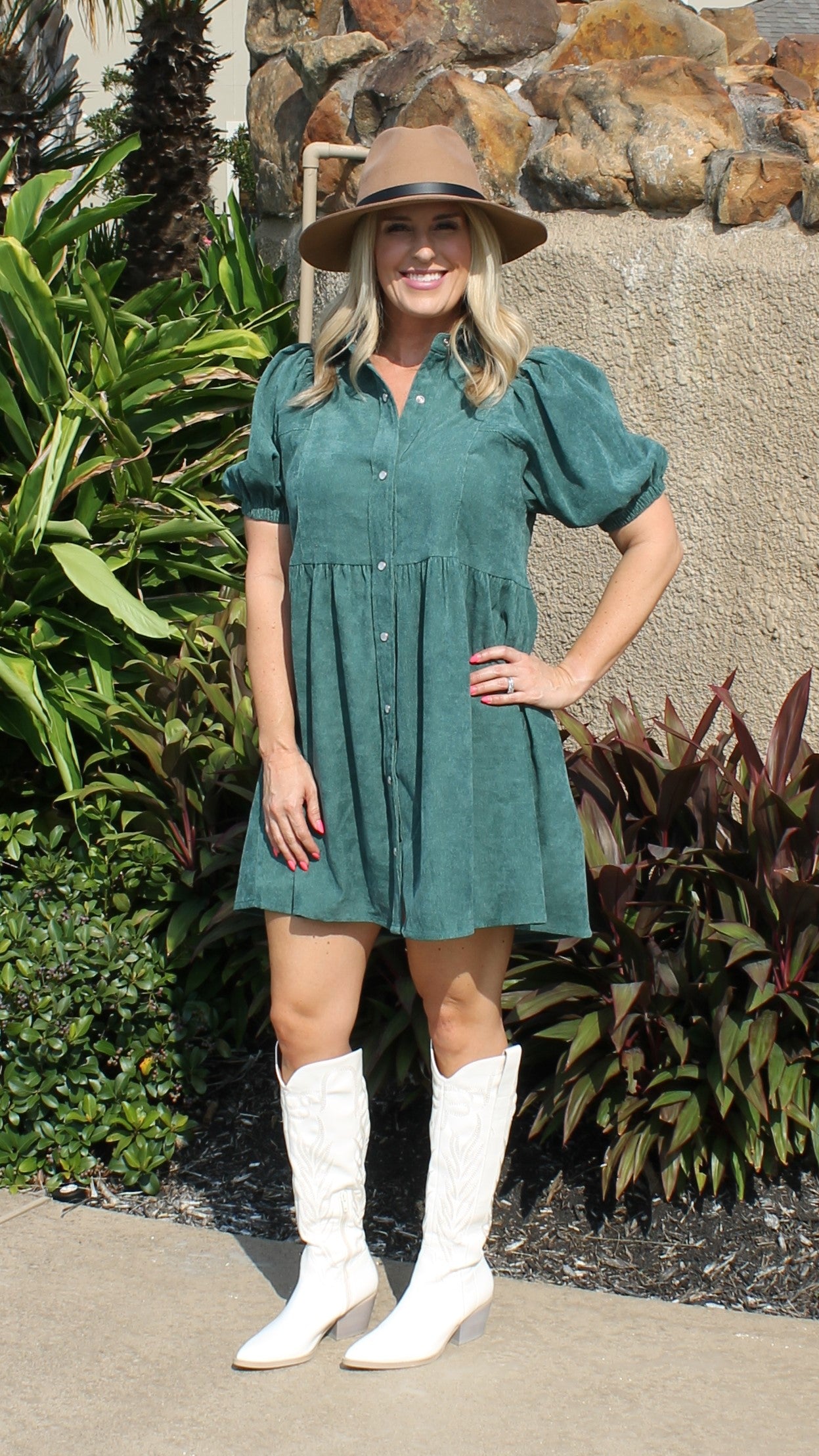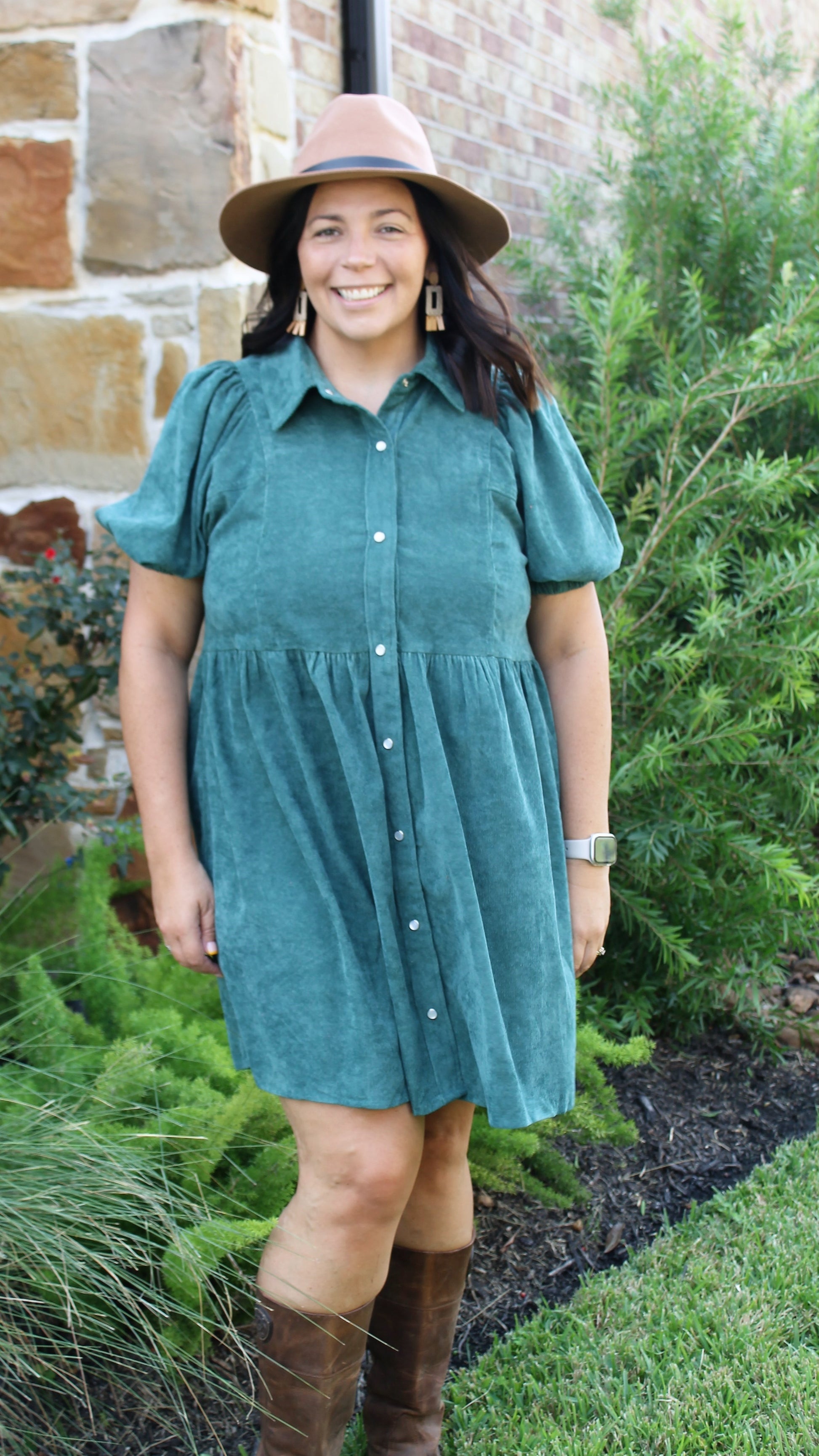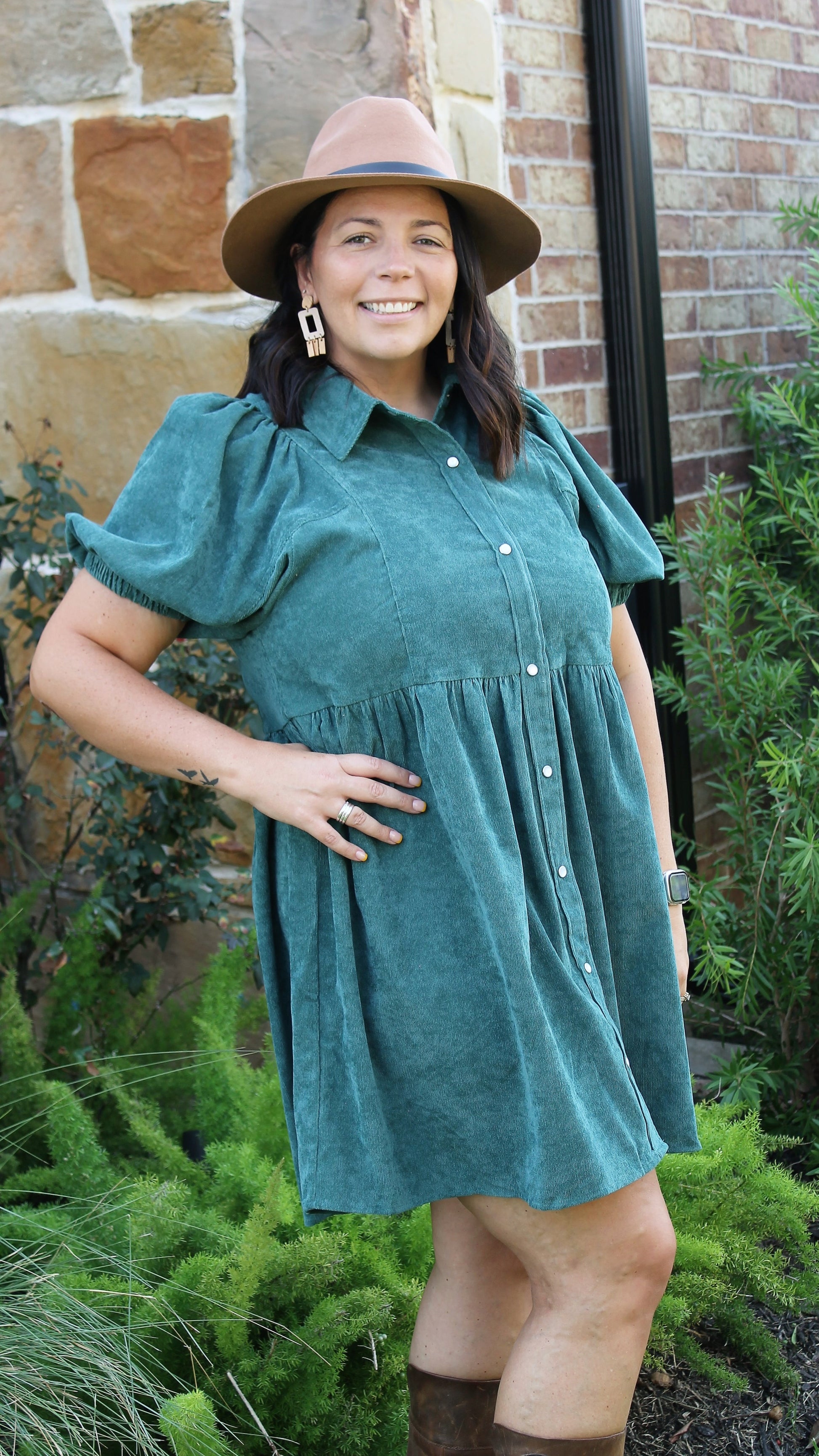 Cute and comfy...dress up or down! Corduroy button up collared mini dress featuring puff sleeves. Unlined. Woven. Non-sheer. Lightweight.