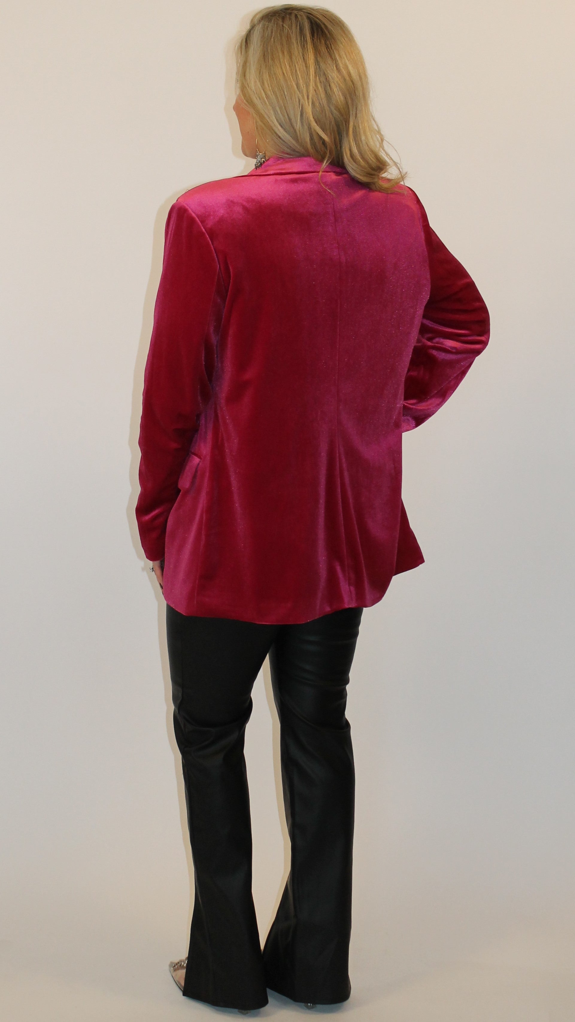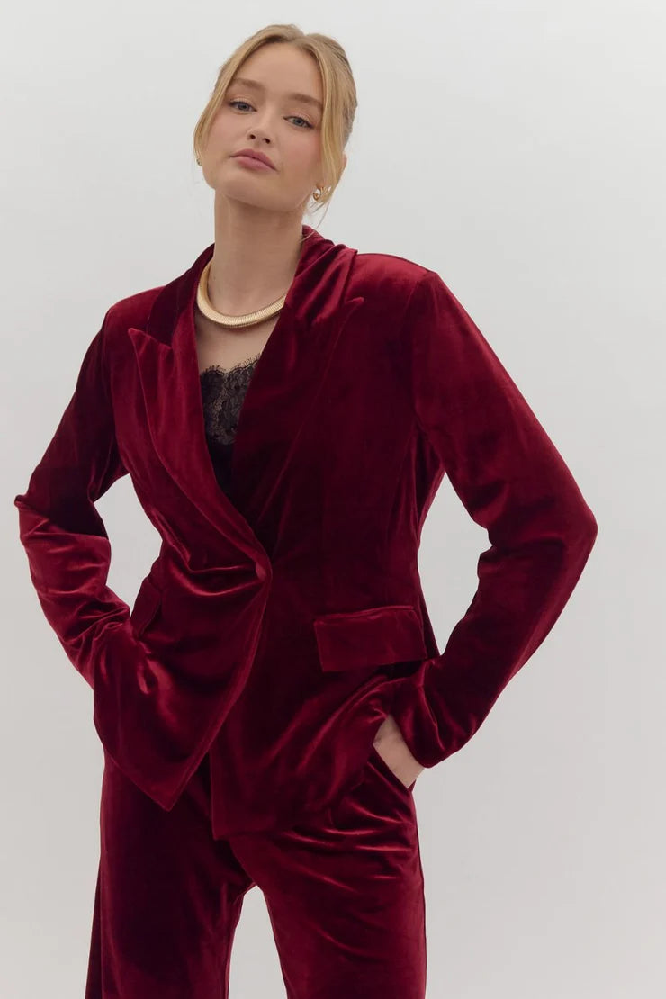 Take any outfit up a notch with this blazer! This jacket features a collared neckline, button front closure, pocket detail, long sleeves, and velvet fabric. Dress up or down!