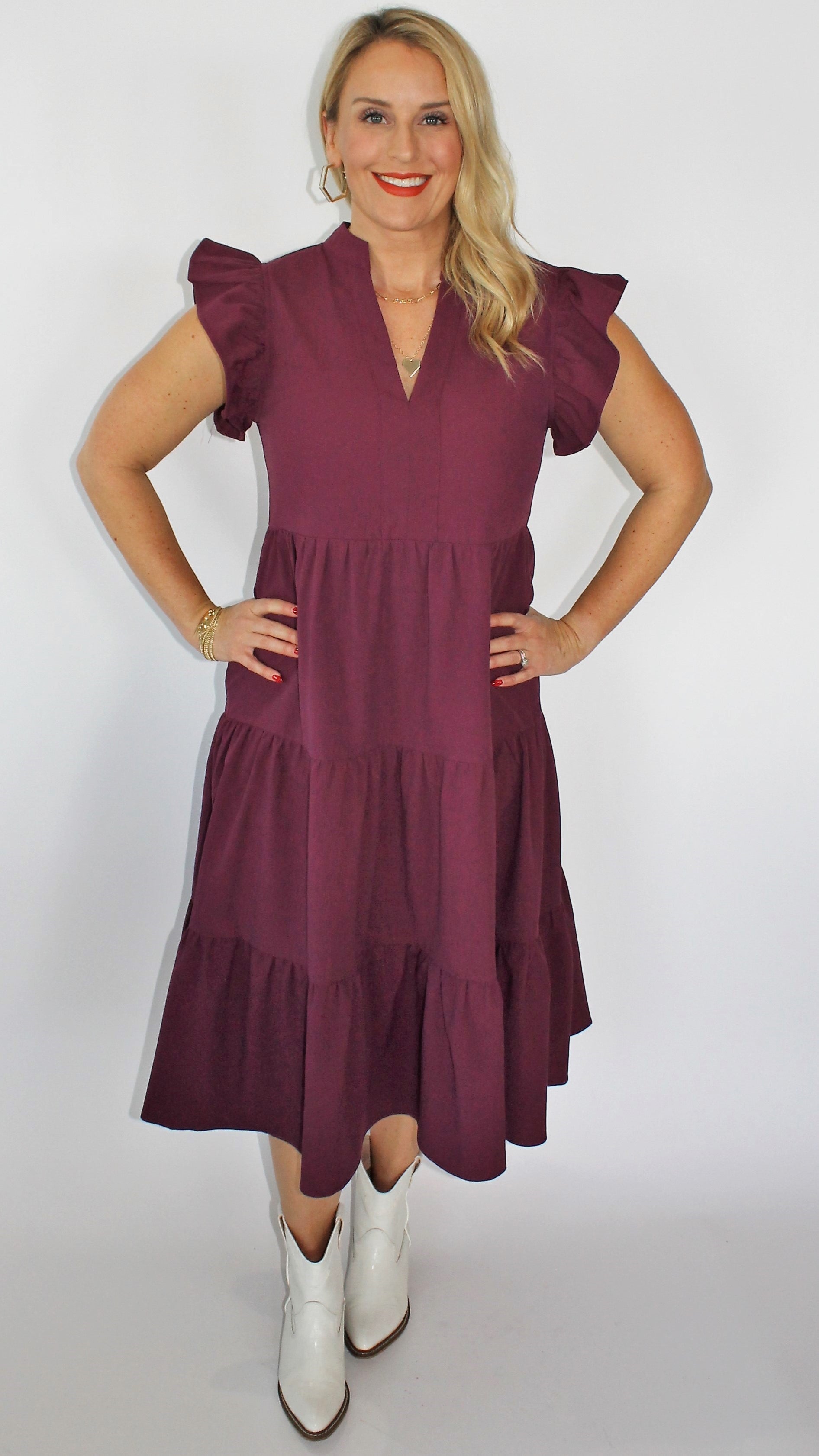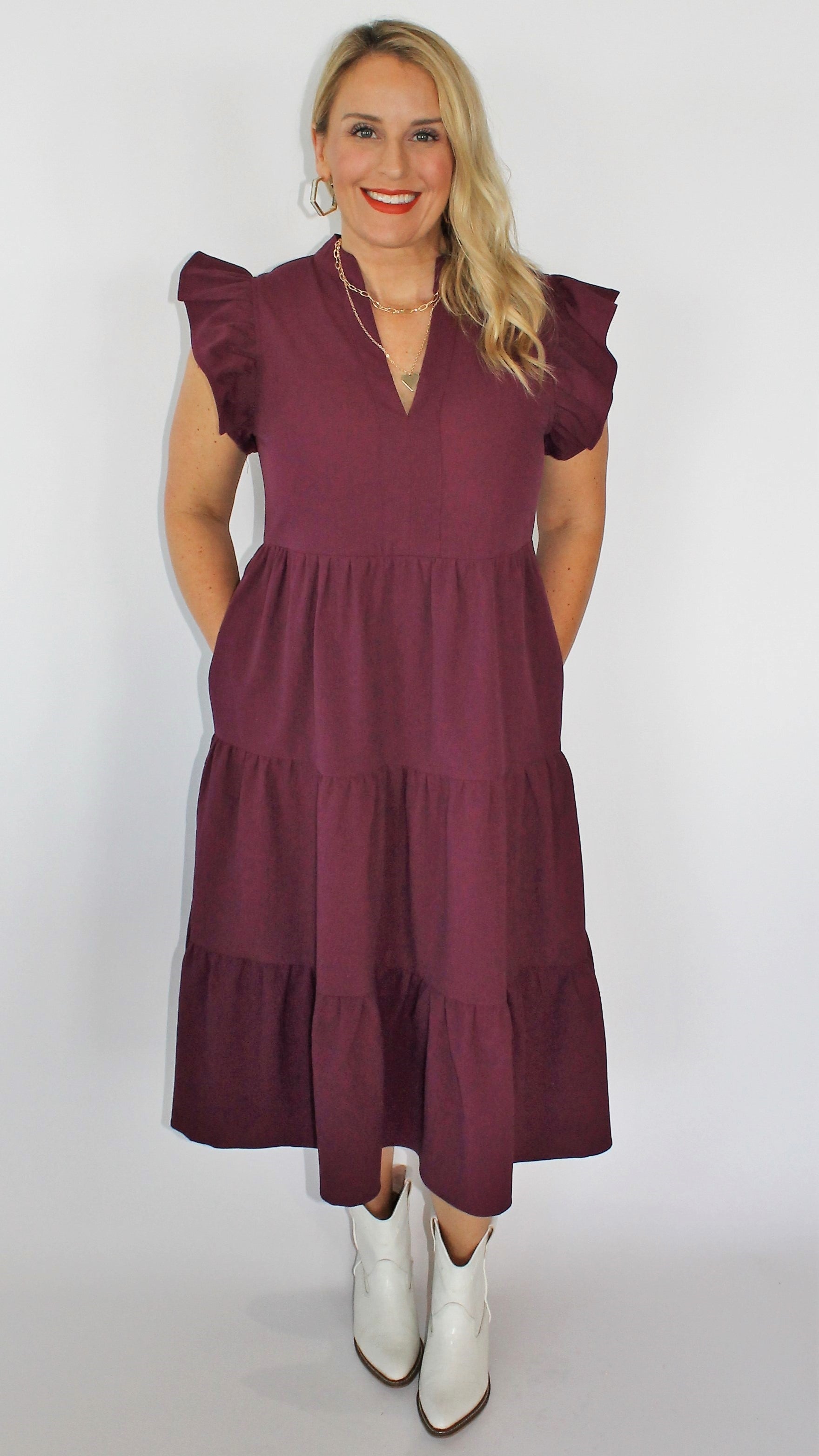 Here is your wear anywhere dress! V-neck short sleeve tiered midi dress featuring wide ruffle sleeves. Pockets at side. Lined. Woven. Non-sheer. Lightweight. Dress it up or down!