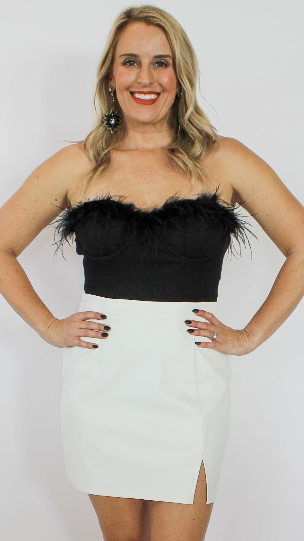 Shown paired with our satin feather bodysuit and feather ribbed bodysuit.